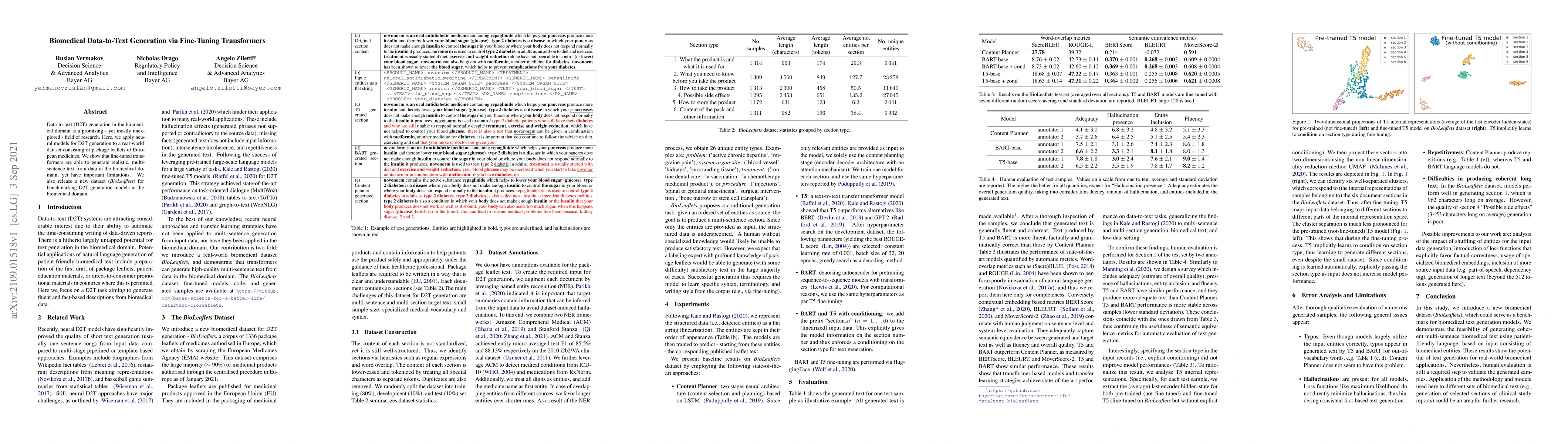 This paper explores data-to-text generation in the biomedical field using fine-tuned transformers, demonstrating their ability to produce realistic multisentence texts from package leaflets. It also highlights limitations and introduces a new dataset, BioLeaflets, for benchmarking such models.