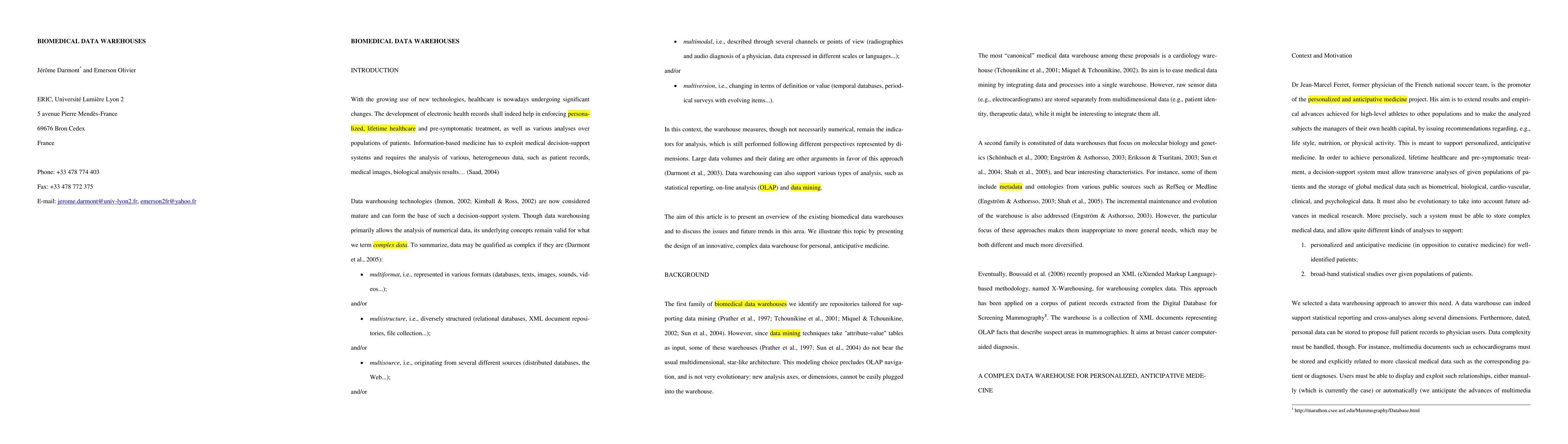 The aim of this article is to present an overview of the existing biomedical data warehouses and to discuss the issues and future trends in this area. We illustrate this topic by presenting the design of an innovative, complex data warehouse for personal, anticipative medicine.