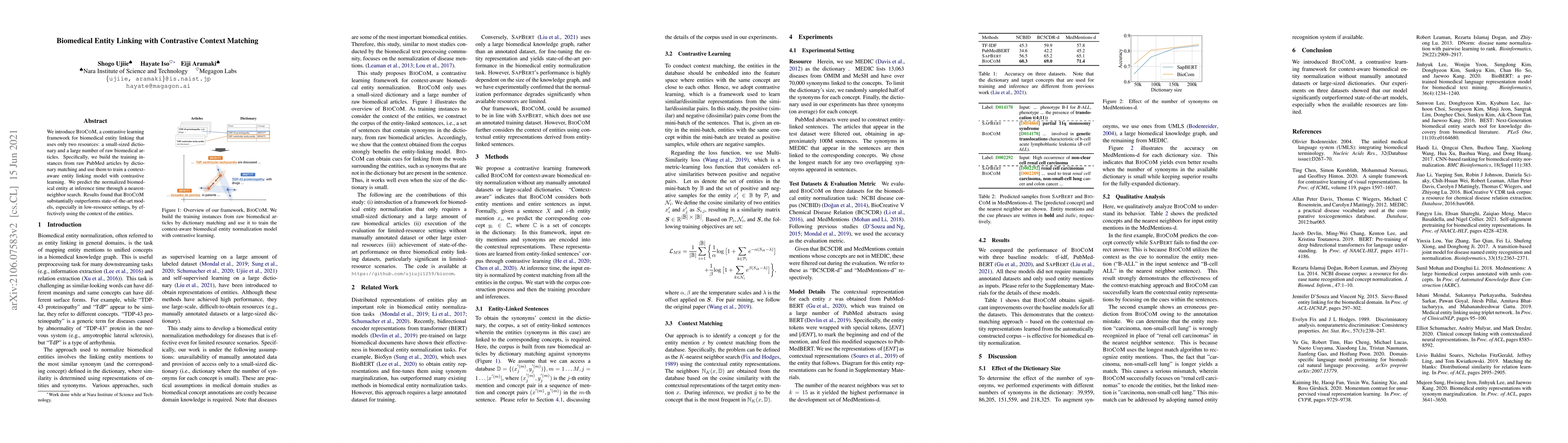BioCoM is a contrastive learning framework for biomedical entity linking that leverages a small dictionary and numerous raw articles for training. It outperforms existing models, particularly in low-resource scenarios, by utilizing context-aware entity linking and contrastive learning.