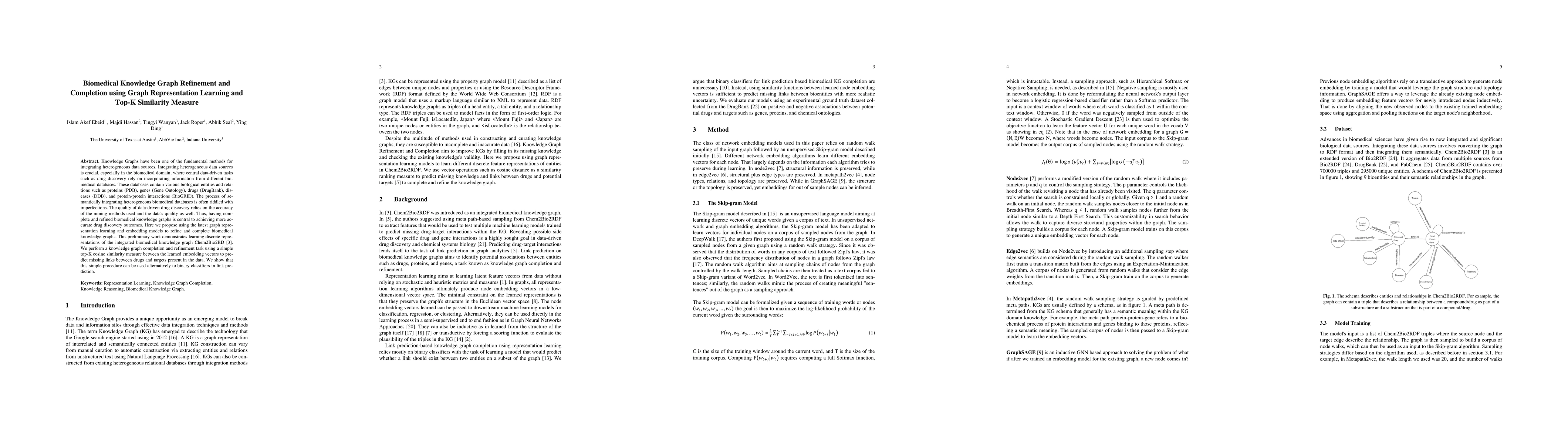 This paper proposes using graph representation learning and a top-K similarity measure to refine and complete biomedical knowledge graphs, aiming to improve data-driven drug discovery. The method demonstrates the completion of the Chem2Bio2RD knowledge graph using learned embeddings and a simple cosine similarity approach for predicting missing links between drugs and targets.