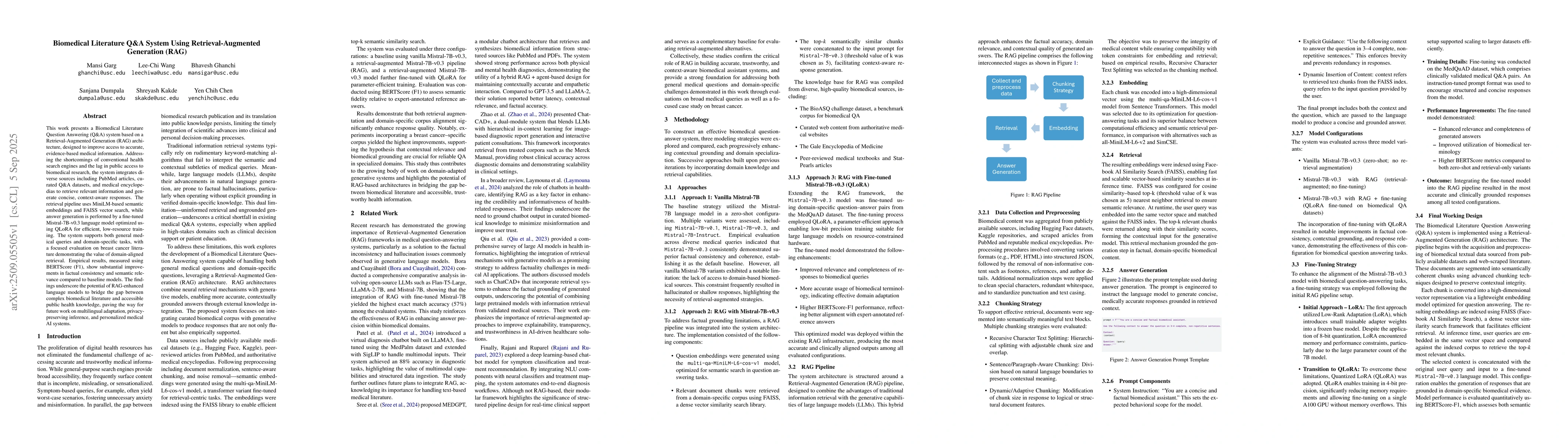 This work presents a Biomedical Literature Question Answering (Q&A) system based on a Retrieval-Augmented Generation (RAG) architecture, designed to improve access to accurate, evidence-based medical information. Addressing the shortcomings of conventional health search engines and the lag in public access to biomedical research, the system integrates diverse sources, including PubMed articles, curated Q&A datasets, and medical encyclopedias ,to retrieve relevant information and generate concise, context-aware responses. The retrieval pipeline uses MiniLM-based semantic embeddings and FAISS vector search, while answer generation is performed by a fine-tuned Mistral-7B-v0.3 language model optimized using QLoRA for efficient, low-resource training. The system supports both general medical queries and domain-specific tasks, with a focused evaluation on breast cancer literature demonstrating the value of domain-aligned retrieval. Empirical results, measured using BERTScore (F1), show substantial improvements in factual consistency and semantic relevance compared to baseline models. The findings underscore the potential of RAG-enhanced language models to bridge the gap between complex biomedical literature and accessible public health knowledge, paving the way for future work on multilingual adaptation, privacy-preserving inference, and personalized medical AI systems.
