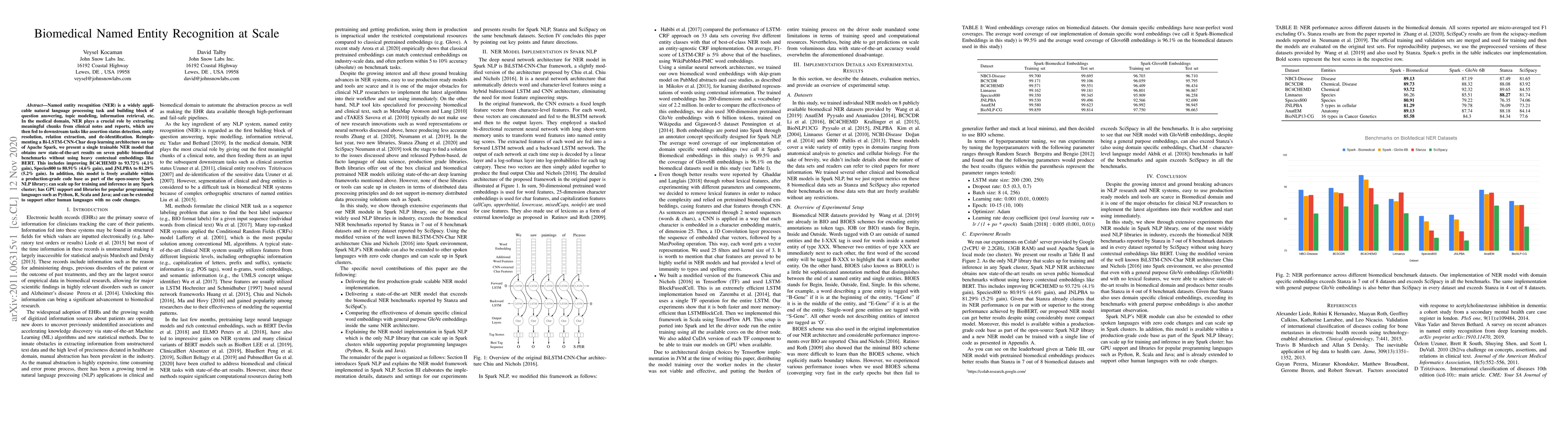 Named entity recognition (NER) is a widely applicable natural language processing task and building block of question answering, topic modeling, information retrieval, etc. In the medical domain, NER plays a crucial role by extracting meaningful chunks from clinical notes and reports, which are then fed to downstream tasks like assertion status detection, entity resolution, relation extraction, and de-identification. Reimplementing a Bi-LSTM-CNN-Char deep learning architecture on top of Apache Spark, we present a single trainable NER model that obtains new state-of-the-art results on seven public biomedical benchmarks without using heavy contextual embeddings like BERT. This includes improving BC4CHEMD to 93.72% (4.1% gain), Species800 to 80.91% (4.6% gain), and JNLPBA to 81.29% (5.2% gain). In addition, this model is freely available within a production-grade code base as part of the open-source Spark NLP library; can scale up for training and inference in any Spark cluster; has GPU support and libraries for popular programming languages such as Python, R, Scala and Java; and can be extended to support other human languages with no code changes.