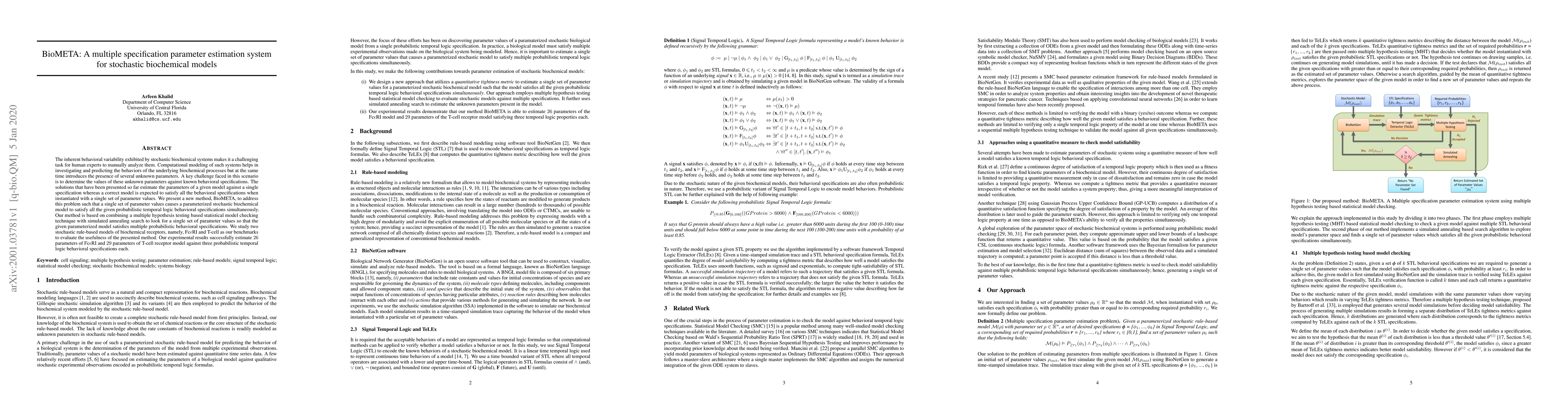 BioMETA is a novel method for estimating multiple unknown parameters in stochastic biochemical models to satisfy all given probabilistic behavioral specifications simultaneously. It combines statistical model checking and simulated annealing to achieve this, demonstrating successful estimation of parameters for two benchmark models.