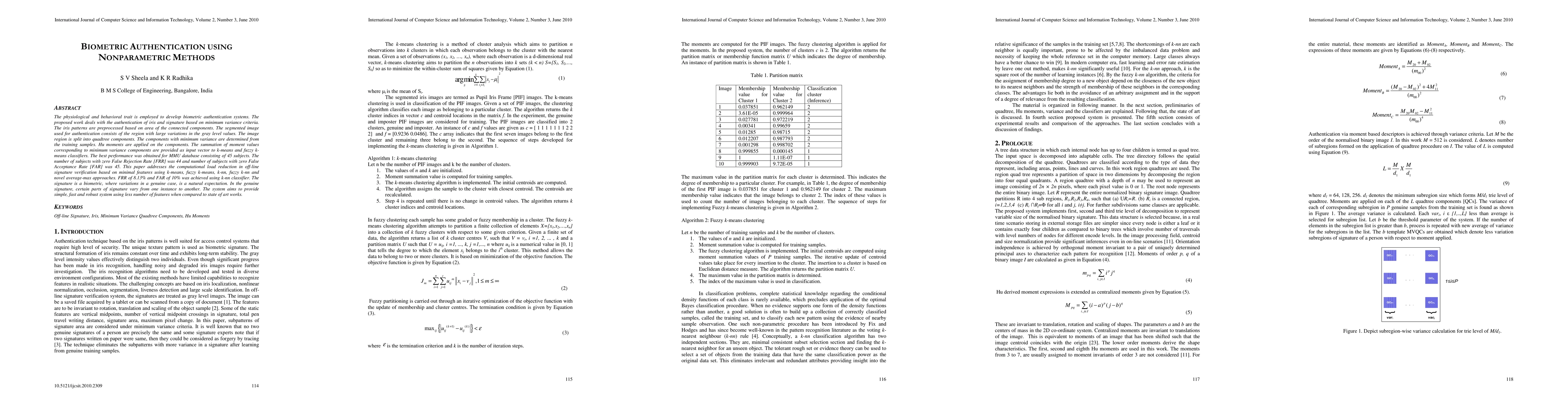 This paper proposes a biometric authentication system using nonparametric methods for iris and signature recognition, achieving high performance with minimal features.