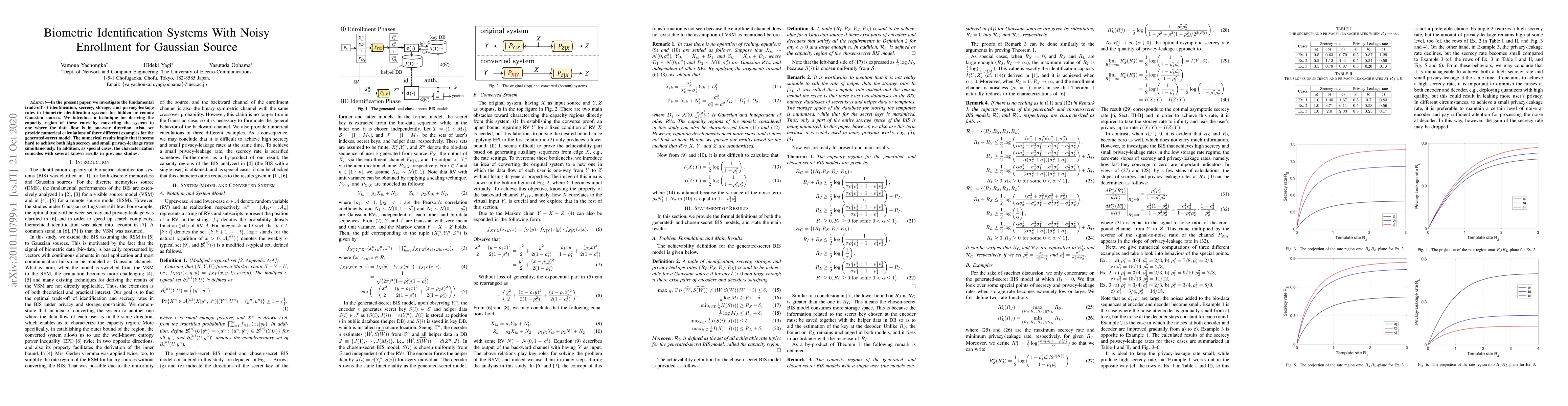 This paper explores the trade-off between identification, secrecy, storage, and privacy-leakage in biometric systems with noisy enrollment for Gaussian sources. It introduces a method for determining the capacity region and provides numerical examples, showing the difficulty in achieving high secrecy and low privacy-leakage simultaneously.