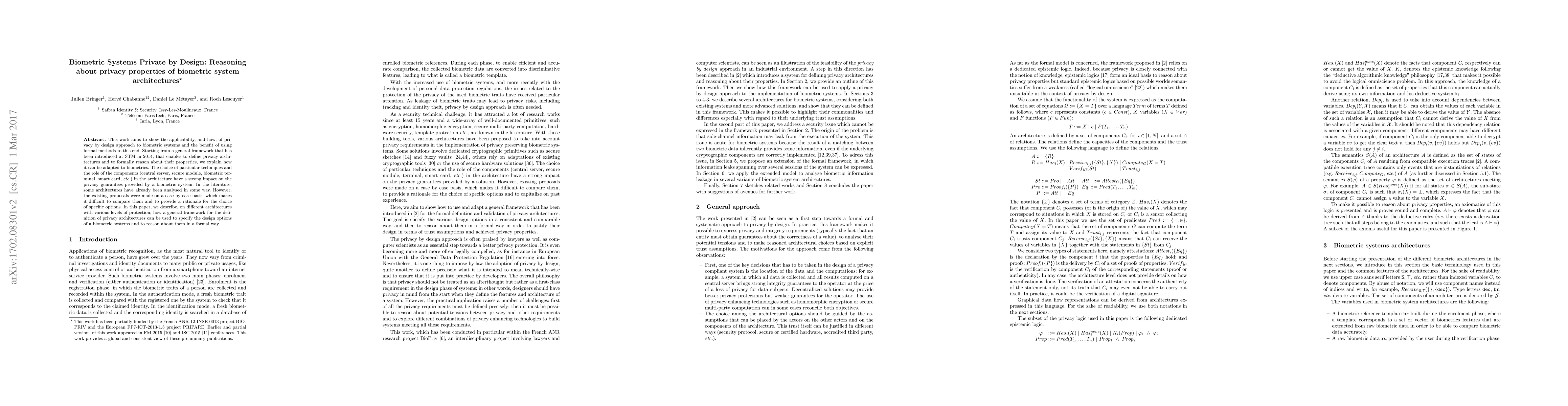 This paper explores the application of privacy by design principles to biometric systems using formal methods, adapting a 2014 framework to analyze various architectures and their privacy properties, aiming to provide a comparative rationale for design choices.