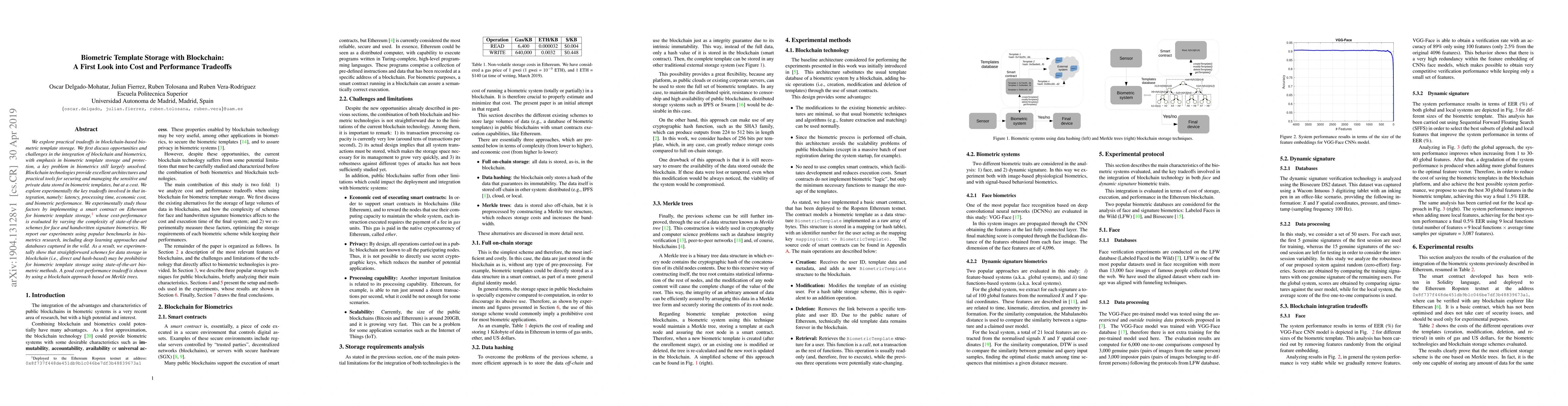 This paper investigates the practical tradeoffs of integrating blockchain with biometric template storage, focusing on latency, processing time, economic cost, and biometric performance. Experimental results show that direct and hash-based blockchain storage methods are too costly for state-of-the-art biometric methods, while Merkle tree-based approaches offer a better cost-performance balance.