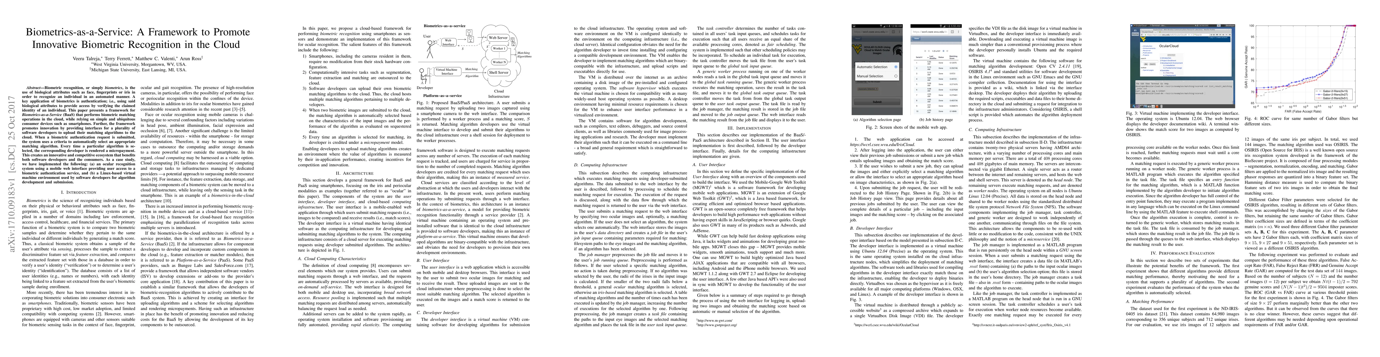 Biometric recognition, or simply biometrics, is the use of biological attributes such as face, fingerprints or iris in order to recognize an individual in an automated manner. A key application of biometrics is authentication; i.e., using said biological attributes to provide access by verifying the claimed identity of an individual. This paper presents a framework for Biometrics-as-a-Service (BaaS) that performs biometric matching operations in the cloud, while relying on simple and ubiquitous consumer devices such as smartphones. Further, the framework promotes innovation by providing interfaces for a plurality of software developers to upload their matching algorithms to the cloud. When a biometric authentication request is submitted, the system uses a criteria to automatically select an appropriate matching algorithm. Every time a particular algorithm is selected, the corresponding developer is rendered a micropayment. This creates an innovative and competitive ecosystem that benefits both software developers and the consumers. As a case study, we have implemented the following: (a) an ocular recognition system using a mobile web interface providing user access to a biometric authentication service, and (b) a Linux-based virtual machine environment used by software developers for algorithm development and submission.