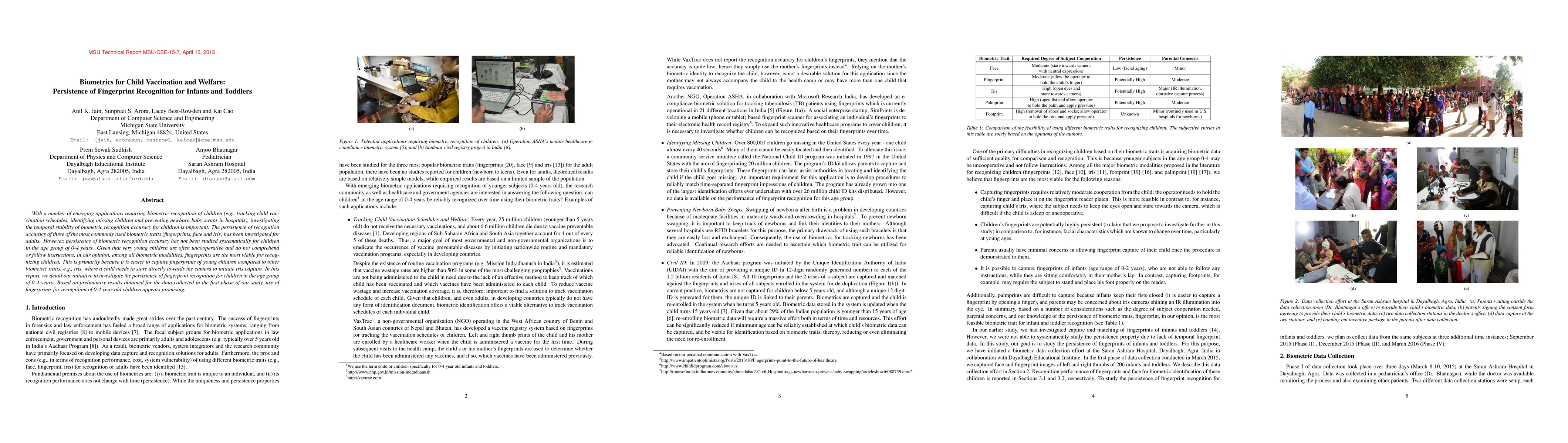 With a number of emerging applications requiring biometric recognition of children (e.g., tracking child vaccination schedules, identifying missing children and preventing newborn baby swaps in hospitals), investigating the temporal stability of biometric recognition accuracy for children is important. The persistence of recognition accuracy of three of the most commonly used biometric traits (fingerprints, face and iris) has been investigated for adults. However, persistence of biometric recognition accuracy has not been studied systematically for children in the age group of 0-4 years. Given that very young children are often uncooperative and do not comprehend or follow instructions, in our opinion, among all biometric modalities, fingerprints are the most viable for recognizing children. This is primarily because it is easier to capture fingerprints of young children compared to other biometric traits, e.g., iris, where a child needs to stare directly towards the camera to initiate iris capture. In this report, we detail our initiative to investigate the persistence of fingerprint recognition for children in the age group of 0-4 years. Based on preliminary results obtained for the data collected in the first phase of our study, use of fingerprints for recognition of 0-4 year-old children appears promising.