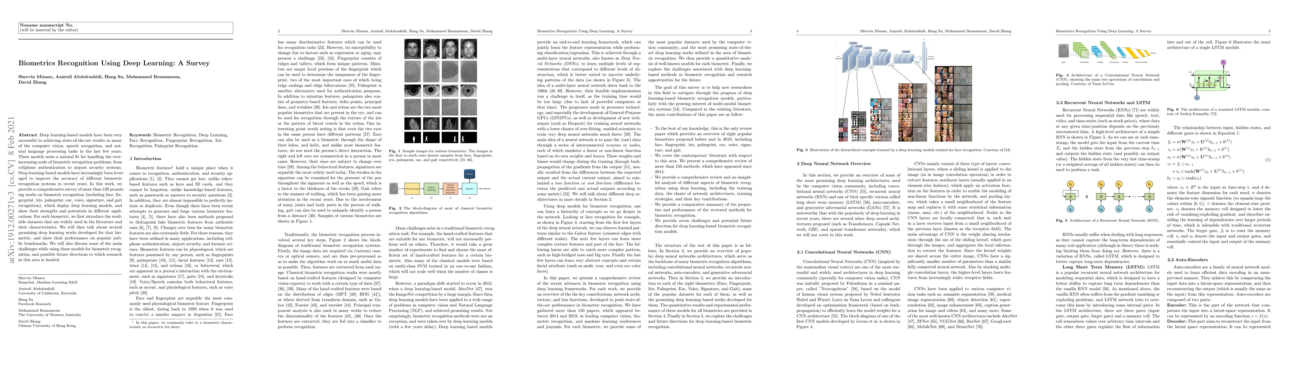 This paper surveys over 120 deep learning-based models for various biometric recognition systems, highlighting their performance on public benchmarks and discussing challenges and future directions. It covers biometrics like face, fingerprint, and voice, and introduces relevant datasets and model applications.