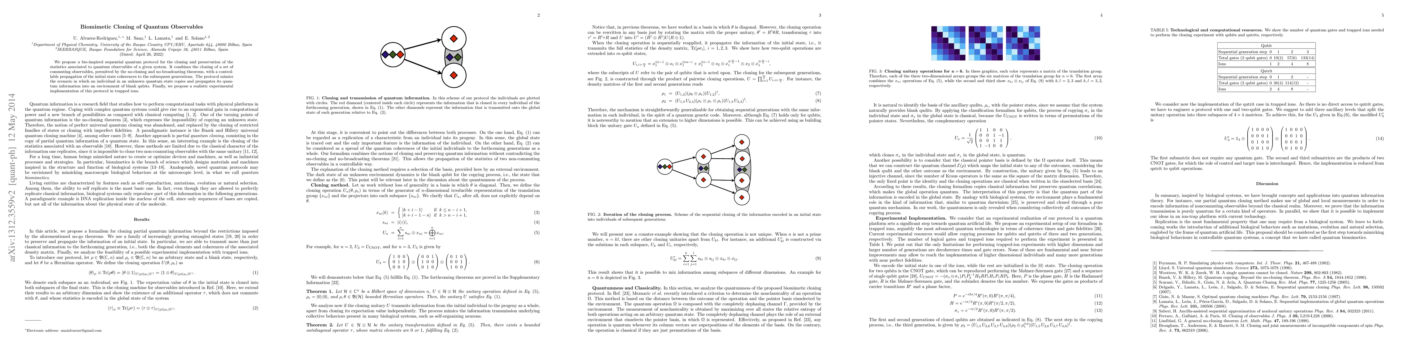 This paper introduces a biomimetic quantum protocol for cloning and preserving quantum observables, leveraging the no-cloning theorem to clone commuting observables while propagating initial state coherences. The protocol is designed for implementation in trapped ions.