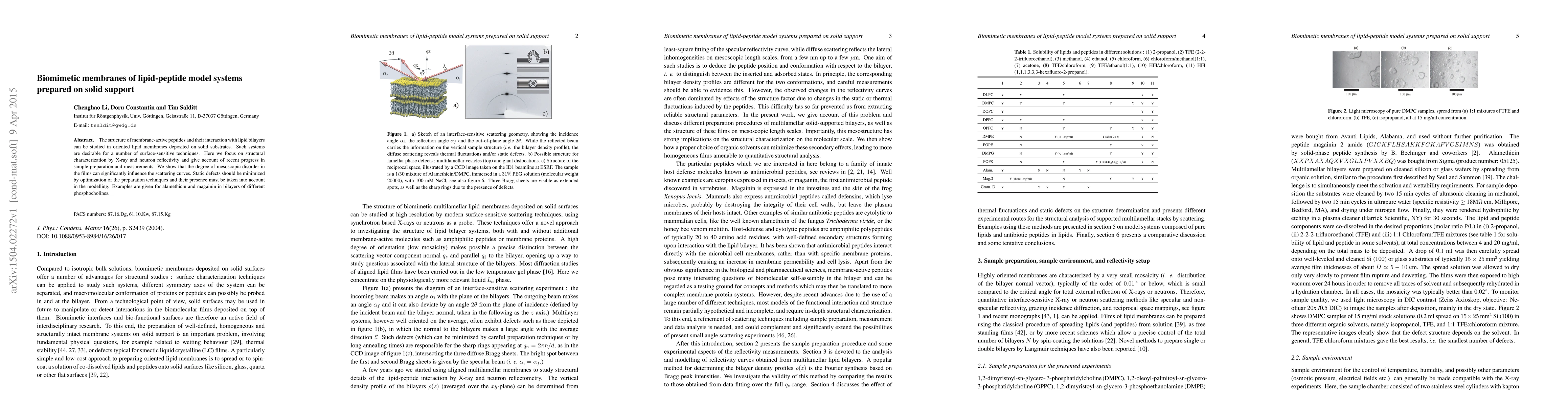 This paper investigates biomimetic membranes composed of lipid-peptide systems on solid supports, focusing on structural characterization using x-ray and neutron reflectivity. It highlights the influence of mesoscopic disorder in the films on scattering curves and emphasizes the need to minimize static defects in preparation techniques for accurate modeling.