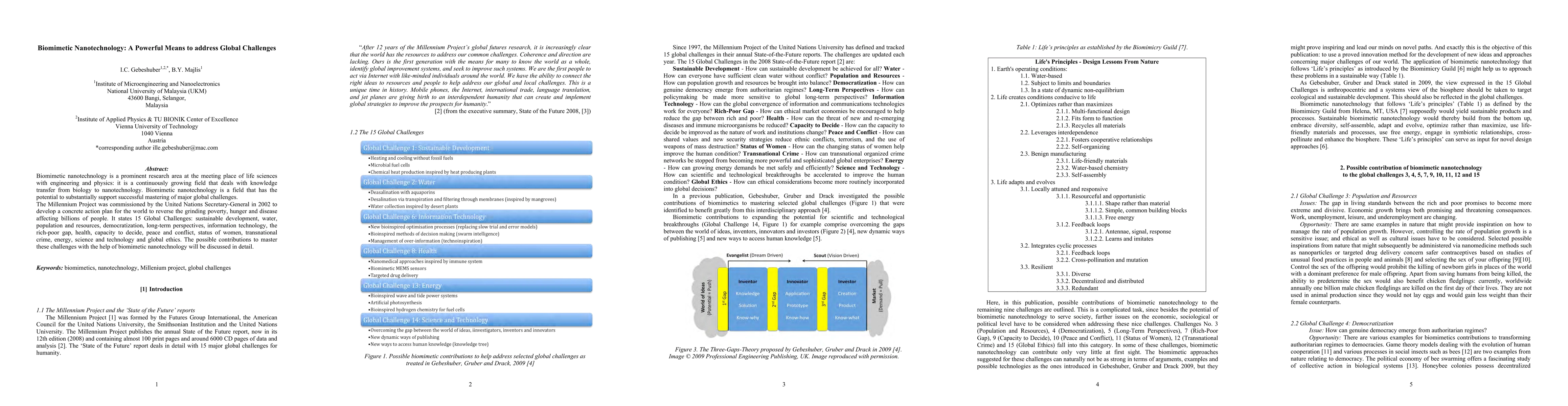 Biomimetic nanotechnology, which transfers biological principles to nanotechnology, holds significant promise for addressing global challenges such as poverty, health, and sustainable development. This field can contribute to overcoming the 15 Global Challenges identified by the Millennium Project, as detailed in the paper.