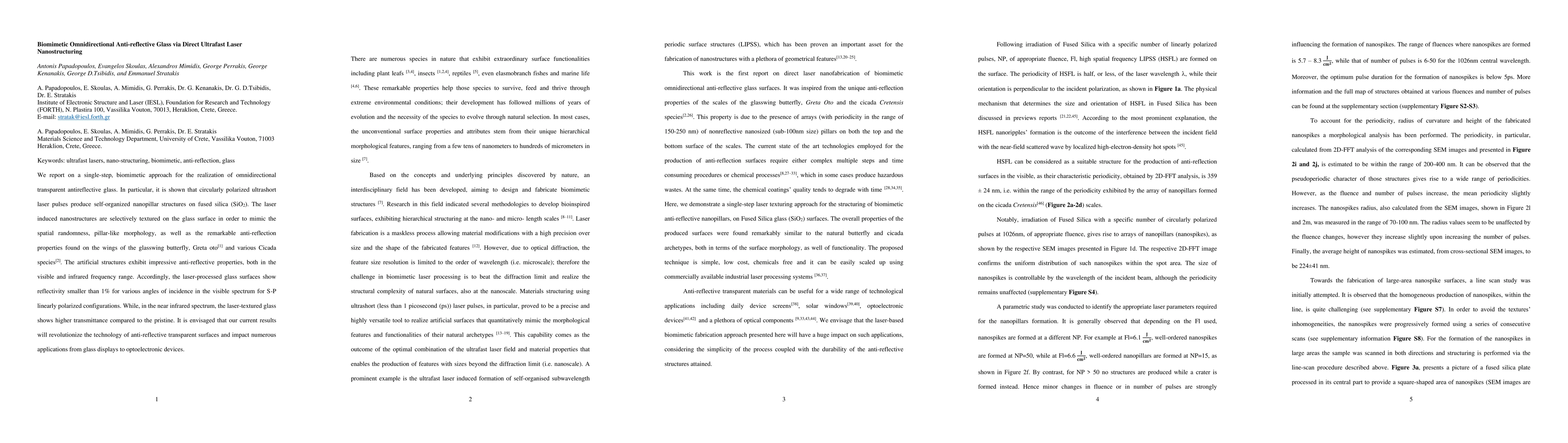 The paper introduces a biomimetic, single-step laser nanostructuring technique for creating omnidirectional anti-reflective glass surfaces, utilizing circularly polarized ultrafast laser pulses to induce nanospikes with random height and width distributions on fused silica.
