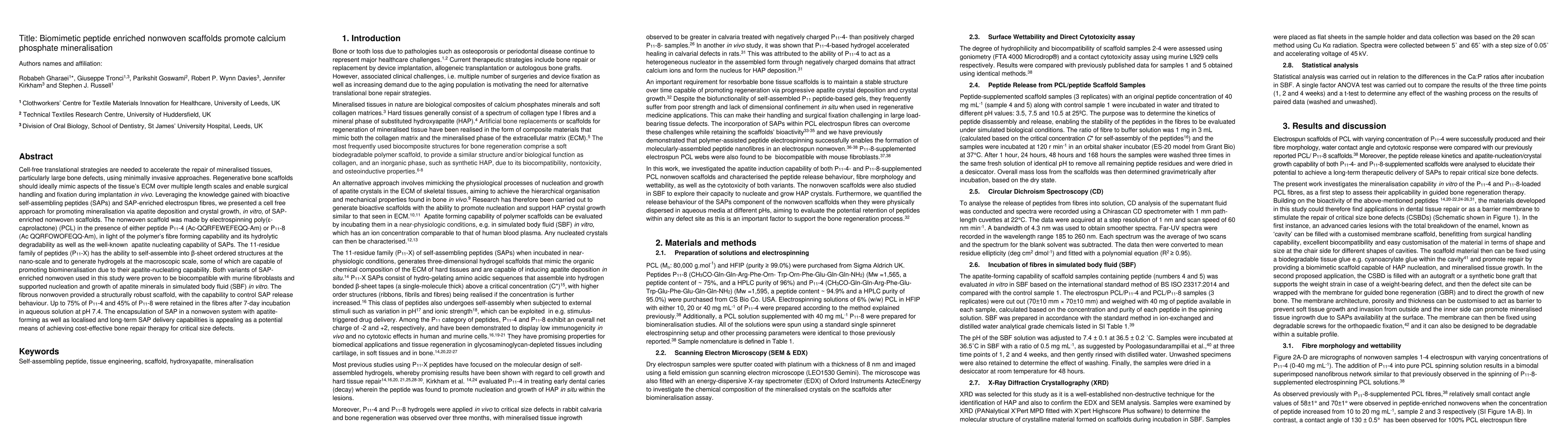 This study presents a biomimetic peptide-enriched nonwoven scaffold made from electrospun poly(epsilon-caprolactone) (PCL) with self-assembling peptides to promote calcium phosphate mineralisation. The scaffolds support apatite nucleation and growth, demonstrating potential for cost-effective bone repair therapy for large defects.