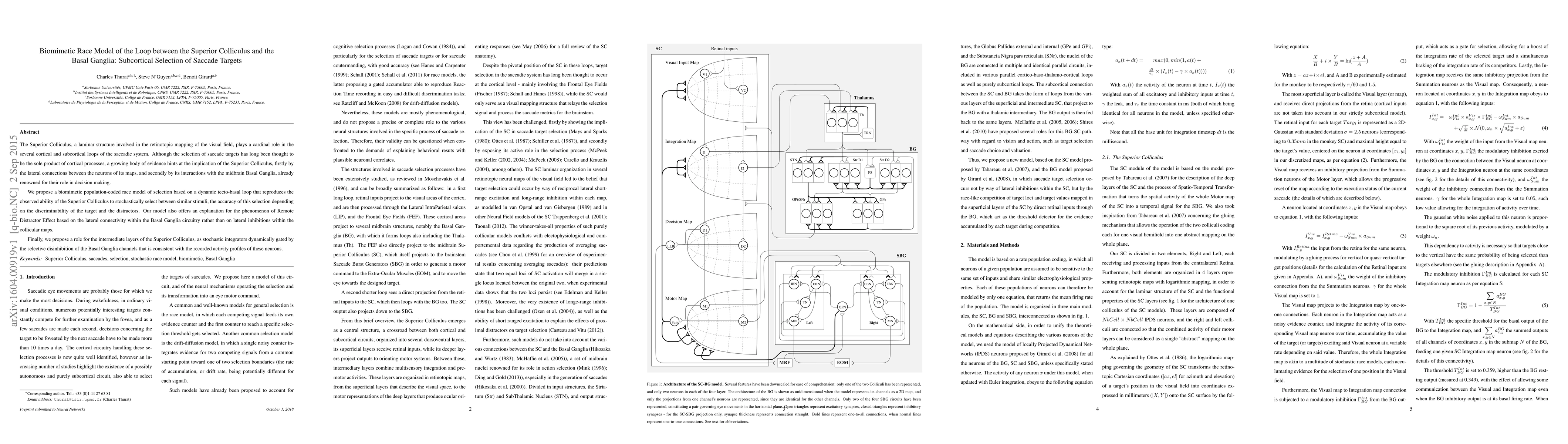 This paper proposes a biomimetic race model explaining how the Superior Colliculus and Basal Ganglia interact to select saccade targets, emphasizing the role of the collicular lateral connections and basal ganglia circuitry in decision-making, rather than solely cortical processes. The model accounts for the Remote Distractor Effect and the function of collicular neurons as stochastic integrators.