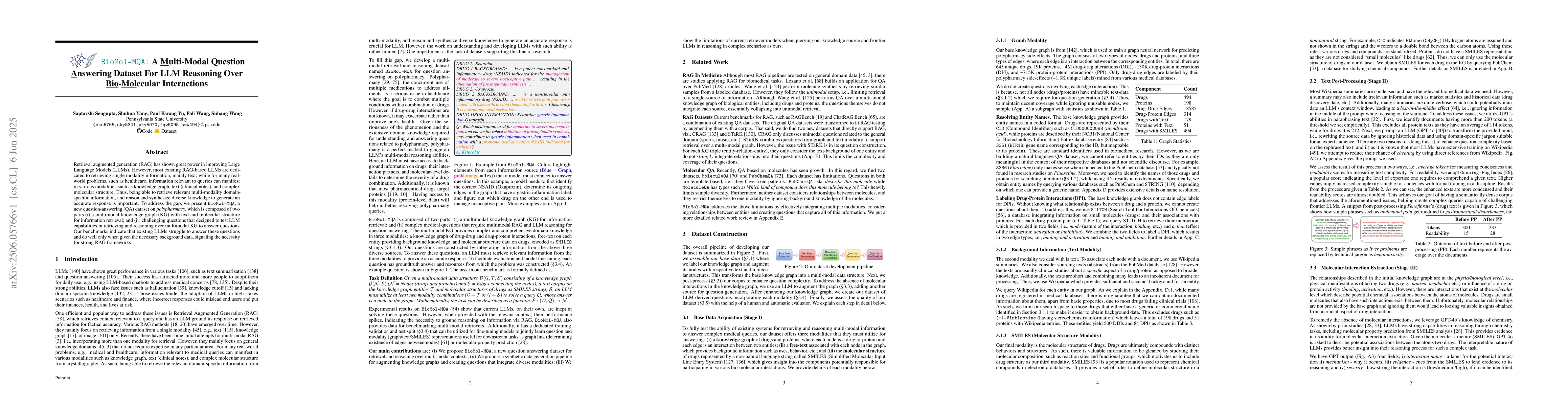 A new question-answering dataset, BioMol-MQA, is introduced to improve Large Language Models' reasoning over bio-molecular interactions in various modalities. The dataset aims to bridge the gap between retrieval augmented generation and multi-modal knowledge graph-based approaches.