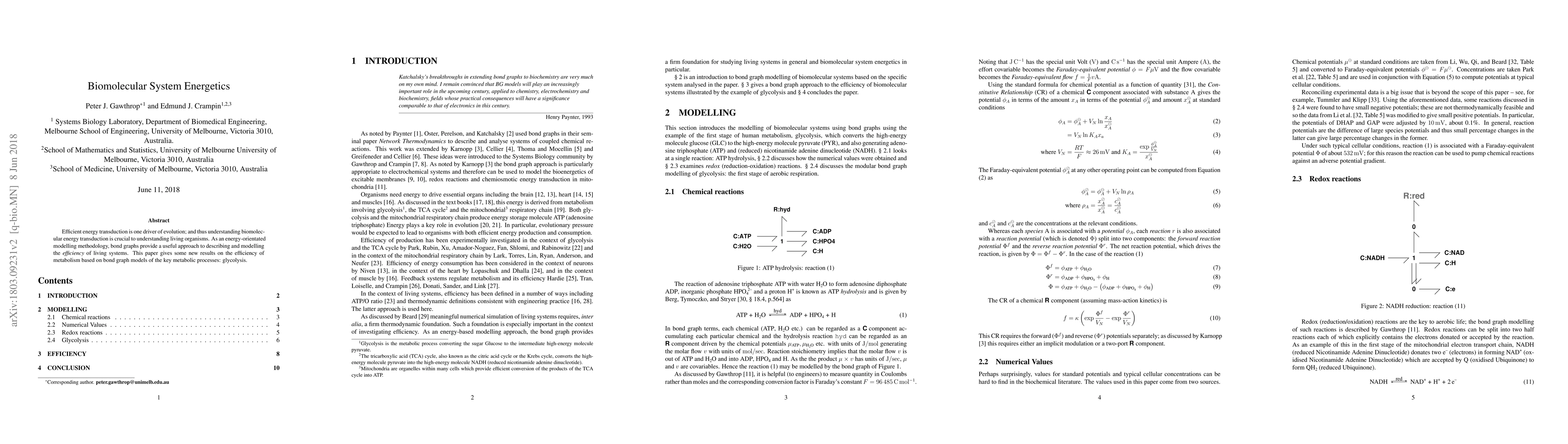 Efficient energy transduction is one driver of evolution; and thus understanding biomolecular energy transduction is crucial to understanding living organisms. As an energy-orientated modelling methodology, bond graphs provide a useful approach to describing and modelling the efficiency of living systems. This paper gives some new results on the efficiency of metabolism based on bond graph models of the key metabolic processes: glycolysis.