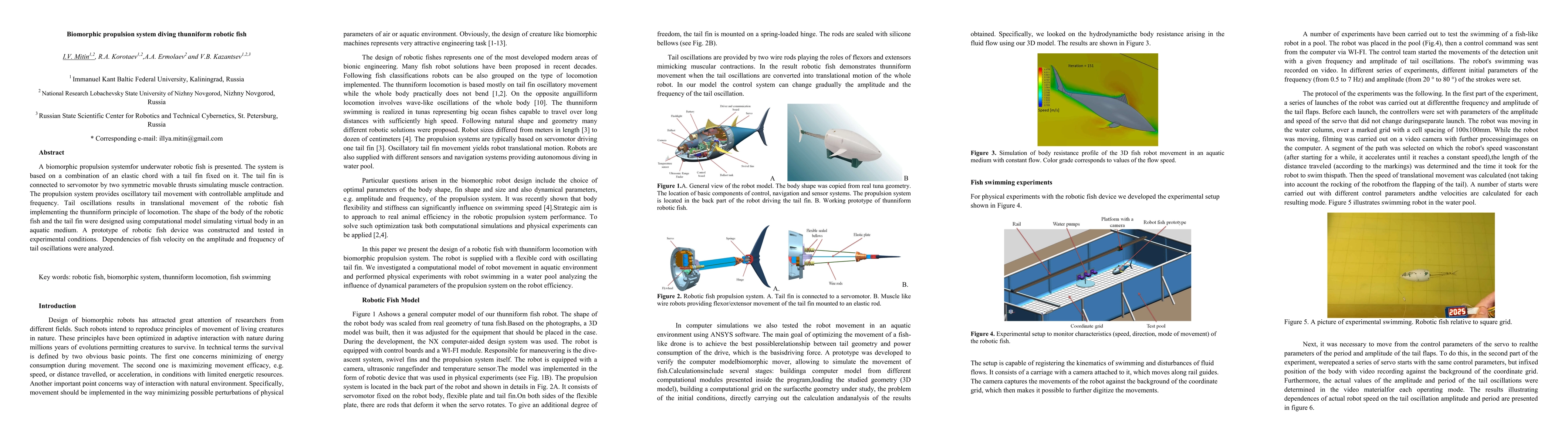 A biomorphic propulsion systemfor underwater robotic fish is presented. The system is based on a combination of an elastic chord with a tail fin fixed on it. The tail fin is connected to servomotor by two symmetric movable thrusts simulating muscle contraction. The propulsion system provides oscillatory tail movement with controllable amplitude and frequency. Tail oscillations results in translational movement of the robotic fish implementing the thunniform principle of locomotion. The shape of the body of the robotic fish and the tail fin were designed using computational model simulating virtual body in an aquatic medium. A prototype of robotic fish device was constructed and tested in experimental conditions. Dependencies of fish velocity on the amplitude and frequency of tail oscillations were analyzed.