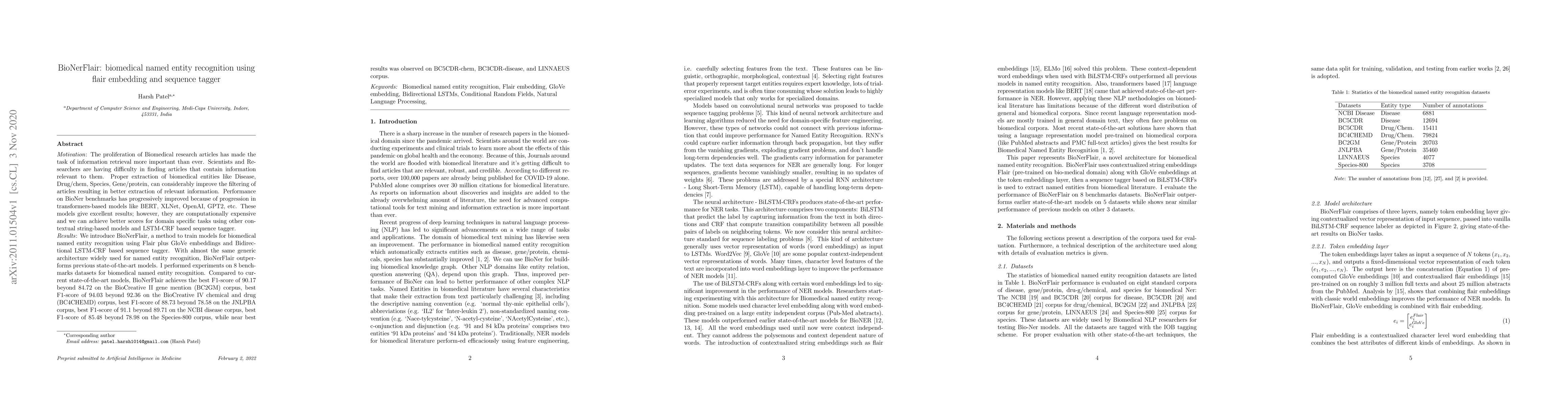 BioNerFlair employs Flair embeddings and a Bidirectional LSTM-CRF sequence tagger for biomedical named entity recognition, achieving superior performance on multiple benchmarks compared to state-of-the-art models. The method demonstrates the best F1-scores across various datasets, indicating enhanced relevance filtering in biomedical research articles.