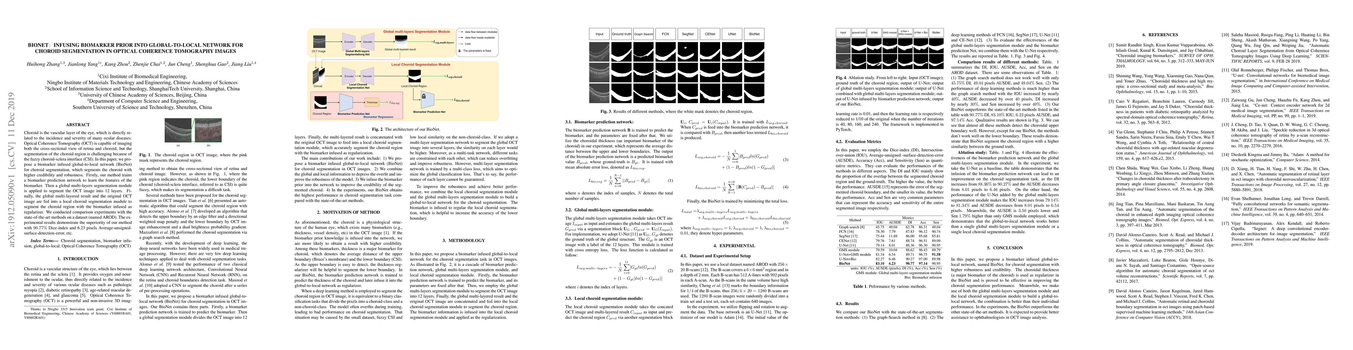 This paper proposes BioNet, a biomarker-infused global-to-local network for choroid segmentation in OCT images, achieving superior segmentation accuracy with a Dice-index of 90.77% and an average surface detection error of 6.23 pixels. The method combines a global multi-layer segmentation with a local choroid segmentation module enhanced by biomarker priors.