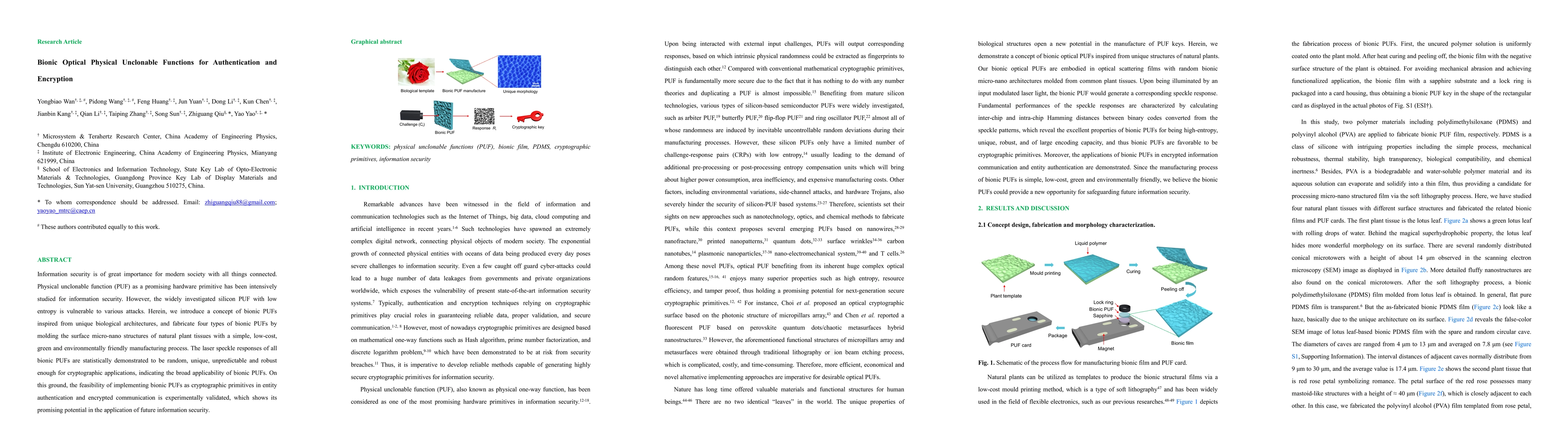 The paper proposes bionic optical PUFs fabricated from natural plant tissues, demonstrating their randomness, uniqueness, unpredictability, and robustness for cryptographic applications.