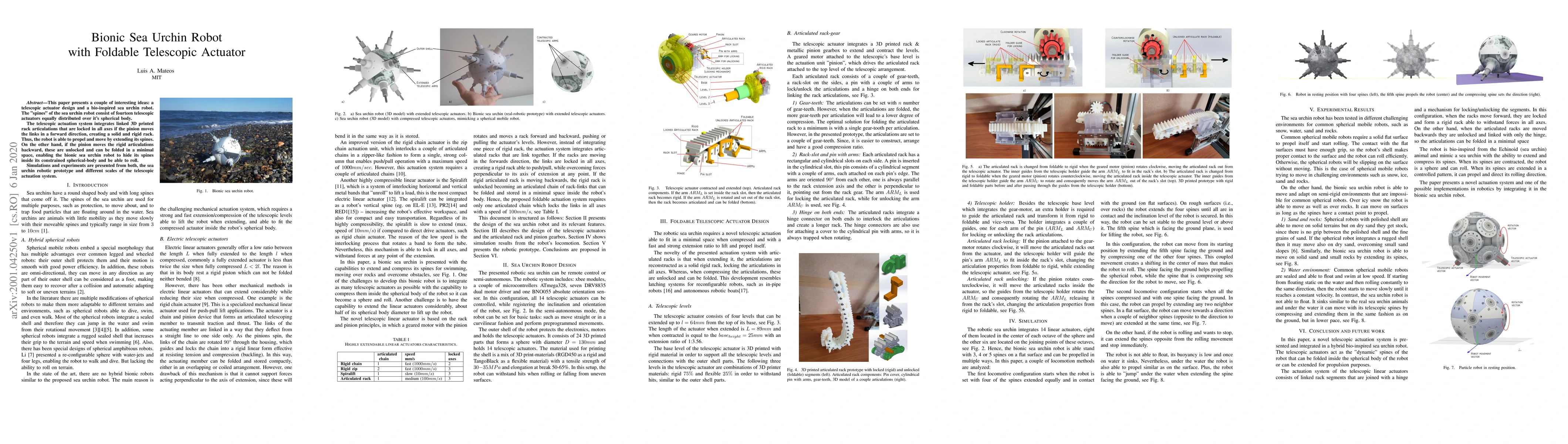 This paper presents a couple of interesting ideas: a telescopic actuator design and a bio-inspired sea urchin robot. The "spines" of the sea urchin robot consist of fourteen telescopic actuators equally distributed over it's spherical body. The telescopic actuation system integrates linked 3D printed rack articulations that are locked in all axes if the pinion moves the links in a forward direction, creating a solid and rigid rack. Thus, the robot is able to propel and move by extending its spines. On the other hand, if the pinion moves the rigid articulations backward, these are unlocked and can be folded in a minimal space, enabling the bionic sea urchin robot to hide its spines inside its constrained spherical-body and be able to roll. Simulations and experiments are presented from both, the sea urchin robotic prototype and different scales of the telescopic actuation system.