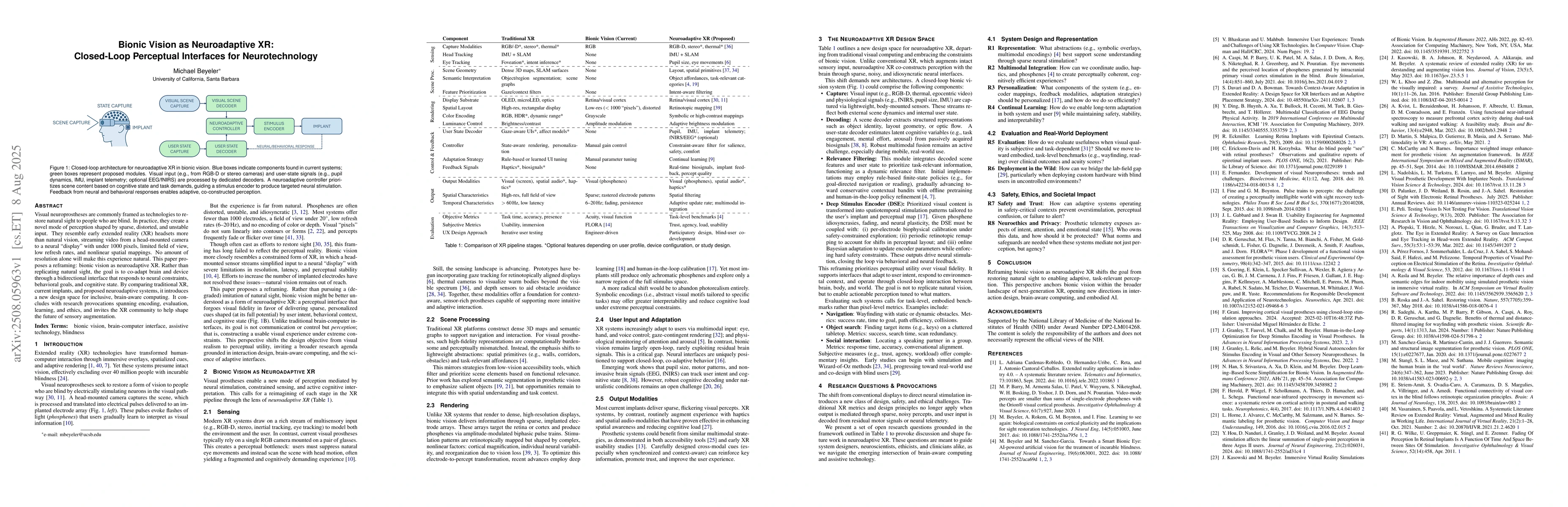 The paper proposes a reframing of bionic vision as neuroadaptive XR, emphasizing co-adaptation between the brain and device through a bidirectional interface that responds to neural constraints, behavioral goals, and cognitive state. It compares traditional XR, current implants, and proposed neuroadaptive systems to introduce a new design space for inclusive, brain-aware computing.