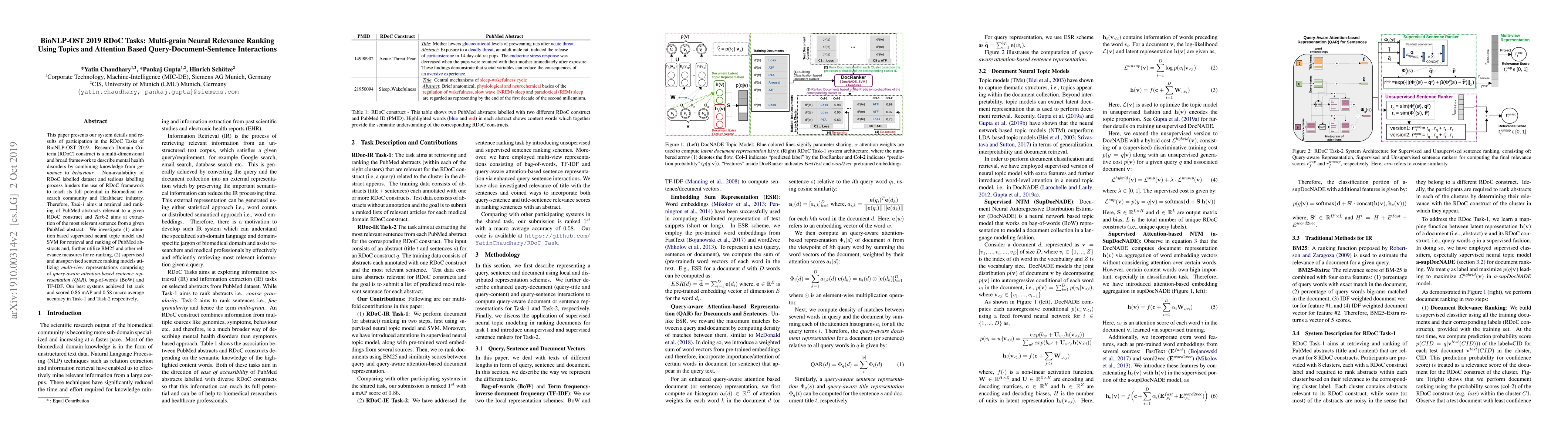 This paper presents our system details and results of participation in the RDoC Tasks of BioNLP-OST 2019. Research Domain Criteria (RDoC) construct is a multi-dimensional and broad framework to describe mental health disorders by combining knowledge from genomics to behaviour. Non-availability of RDoC labelled dataset and tedious labelling process hinders the use of RDoC framework to reach its full potential in Biomedical research community and Healthcare industry. Therefore, Task-1 aims at retrieval and ranking of PubMed abstracts relevant to a given RDoC construct and Task-2 aims at extraction of the most relevant sentence from a given PubMed abstract. We investigate (1) attention based supervised neural topic model and SVM for retrieval and ranking of PubMed abstracts and, further utilize BM25 and other relevance measures for re-ranking, (2) supervised and unsupervised sentence ranking models utilizing multi-view representations comprising of query-aware attention-based sentence representation (QAR), bag-of-words (BoW) and TF-IDF. Our best systems achieved 1st rank and scored 0.86 mean average precision (mAP) and 0.58 macro average accuracy (MAA) in Task-1 and Task-2 respectively.