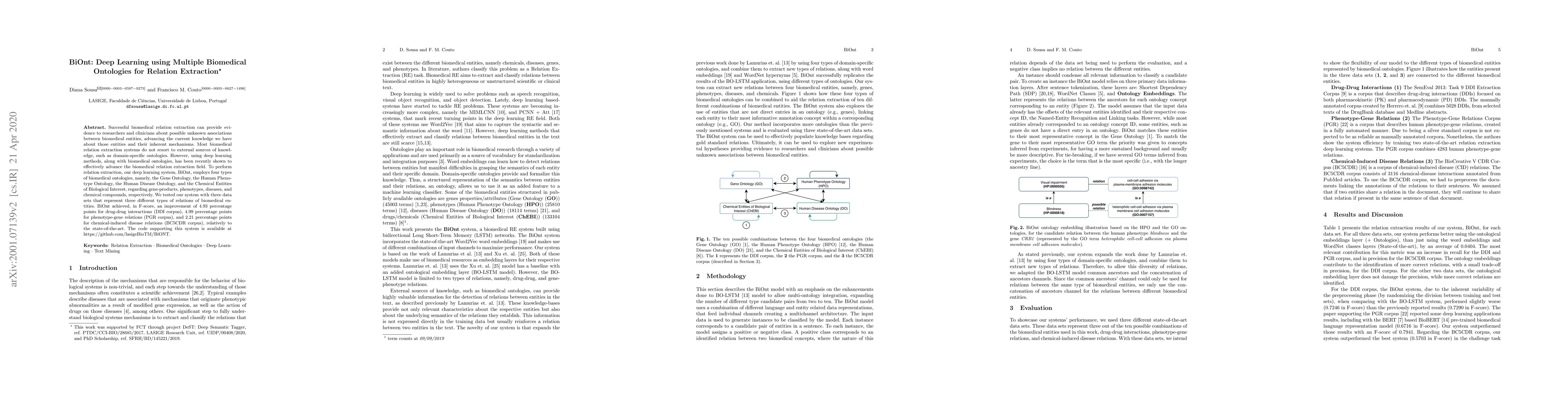 BiOnt integrates deep learning with multiple biomedical ontologies to enhance biomedical relation extraction, achieving notable improvements in F-scores across drug-drug interactions, phenotype-gene relations, and chemical-induced disease relations. The system utilizes Gene Ontology, Human Phenotype Ontology, Human Disease Ontology, and Chemical Entities of Biological Interest for its analysis.