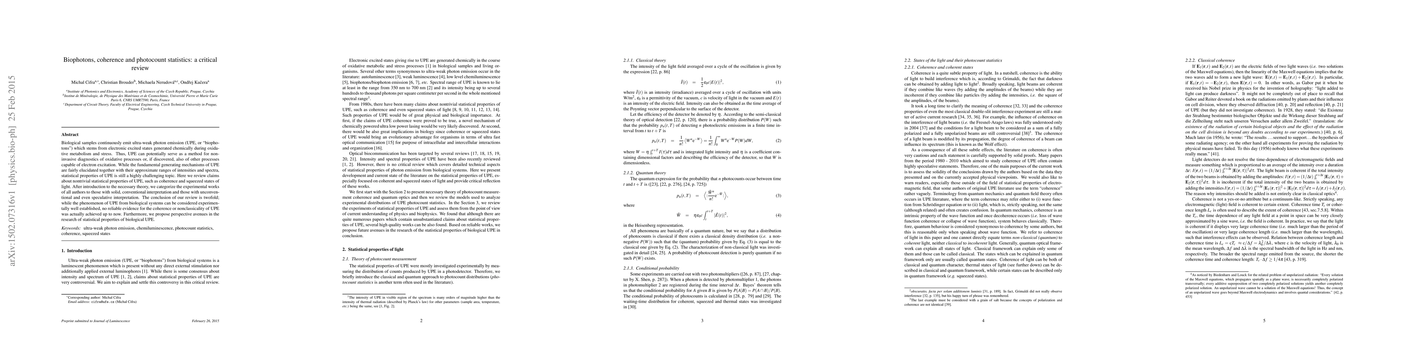 The paper critically reviews the statistical properties of ultra-weak photon emission (UPE) from biological systems, categorizing experimental works into conventional and speculative interpretations.