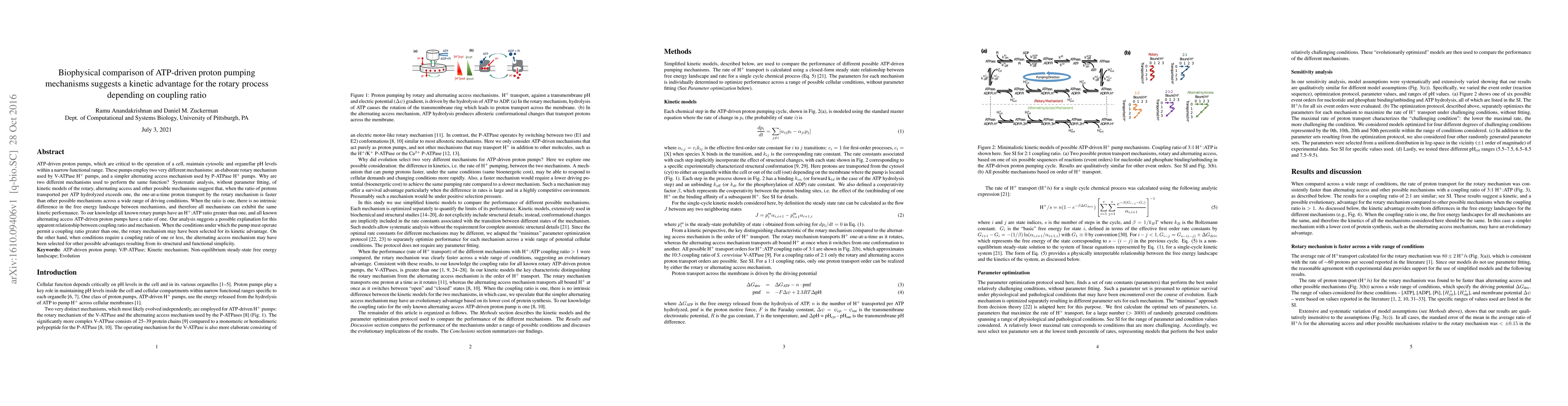 ATP-driven proton pumps, which are critical to the operation of a cell, maintain cytosolic and organellar pH levels within a narrow functional range. These pumps employ two very different mechanisms: an elaborate rotary mechanism used by V-ATPase H+ pumps, and a simpler alternating access mechanism used by P-ATPase H+ pumps. Why are two different mechanisms used to perform the same function? Systematic analysis, without parameter fitting, of kinetic models of the rotary, alternating access and other possible mechanisms suggest that, when the ratio of protons transported per ATP hydrolyzed exceeds one, the one-at-a-time proton transport by the rotary mechanism is faster than other possible mechanisms across a wide range of driving conditions. When the ratio is one, there is no intrinsic difference in the free energy landscape between mechanisms, and therefore all mechanisms can exhibit the same kinetic performance. To our knowledge all known rotary pumps have an H+:ATP ratio greater than one, and all known alternating access ATP-driven proton pumps have a ratio of one. Our analysis suggests a possible explanation for this apparent relationship between coupling ratio and mechanism. When the conditions under which the pump must operate permit a coupling ratio greater than one, the rotary mechanism may have been selected for its kinetic advantage. On the other hand, when conditions require a coupling ratio of one or less, the alternating access mechanism may have been selected for other possible advantages resulting from its structural and functional simplicity.
