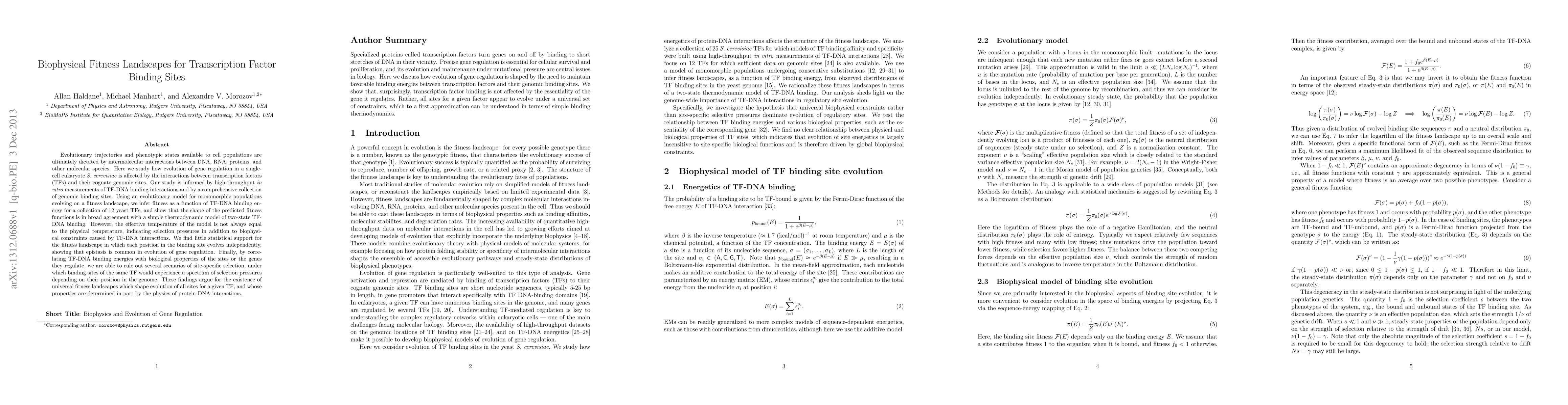 This study investigates how transcription factor (TF)-DNA binding interactions influence the evolution of gene regulation in yeast, revealing that fitness landscapes are shaped by both biophysical constraints and additional selection pressures. The research finds evidence of epistasis and universal fitness landscapes for TFs, rather than independent evolution at each binding site position.