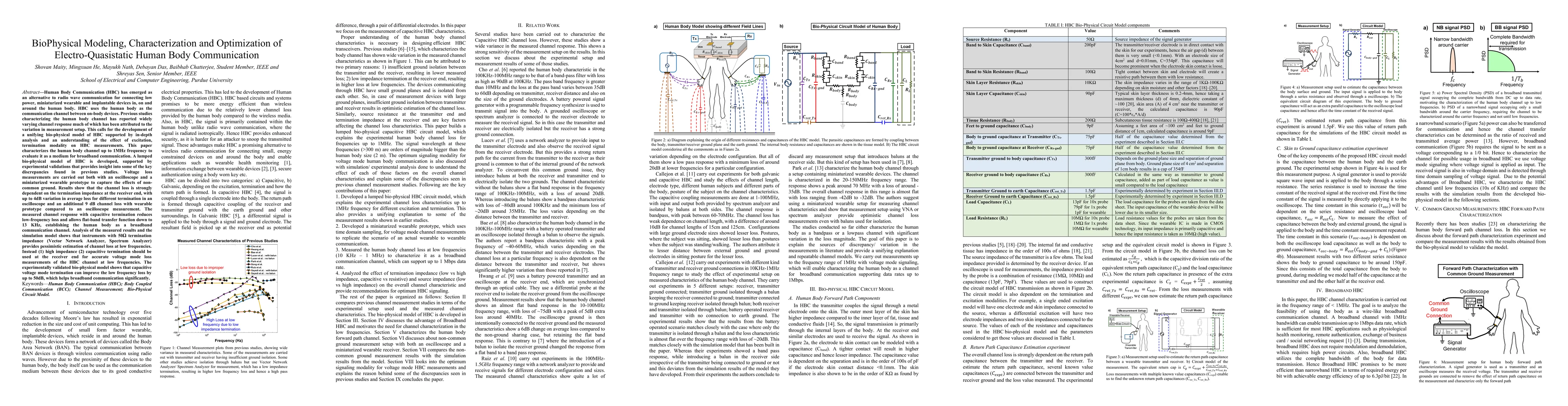 This paper develops a biophysical model for Human Body Communication (HBC) and characterizes the human body channel up to 1MHz, revealing significant variations in channel loss due to termination impedance. Experimental results show that capacitive termination and high impedance at the receiver end minimize low-frequency loss, enabling broadband communication.