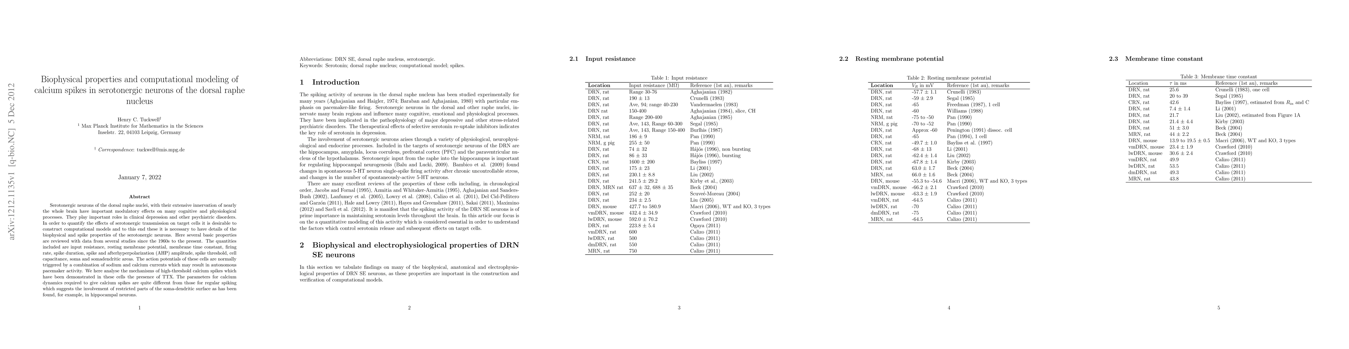This paper reviews biophysical properties and computational modeling of calcium spikes in serotonergic neurons of the dorsal raphe nucleus, emphasizing their role in modulating cognitive and physiological processes and their relevance in psychiatric disorders. The study analyzes high-threshold calcium spikes, suggesting localized involvement in spike generation akin to hippocampal neurons.