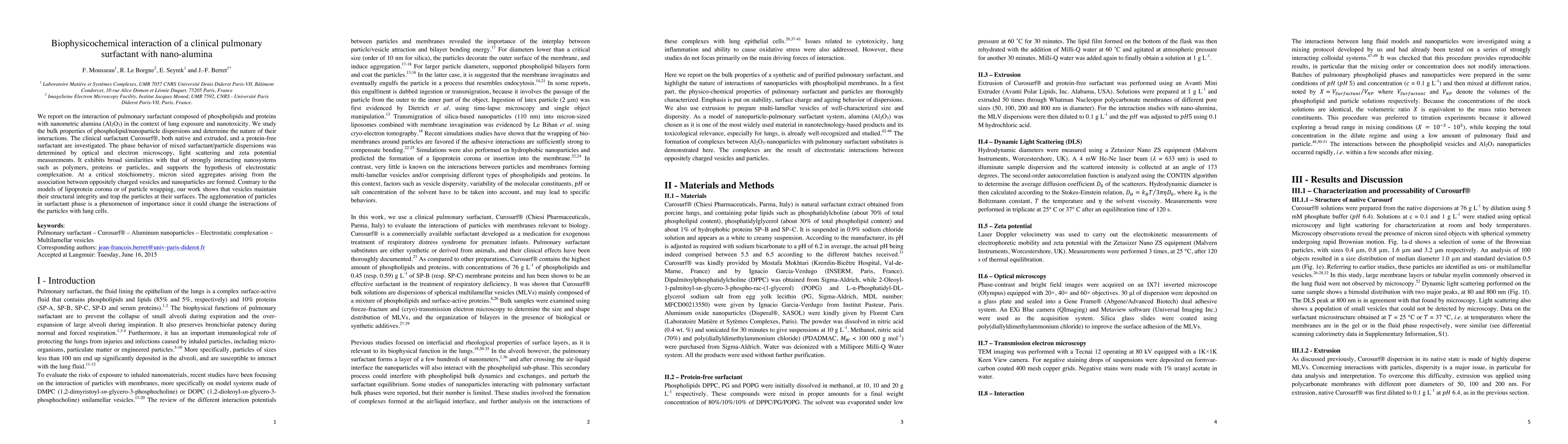 This study investigates the interaction between pulmonary surfactant and nano-alumina, revealing that surfactant vesicles maintain structural integrity while trapping nanoparticles at their surfaces, forming aggregates at a critical stoichiometry, which may alter nanoparticle interactions with lung cells.