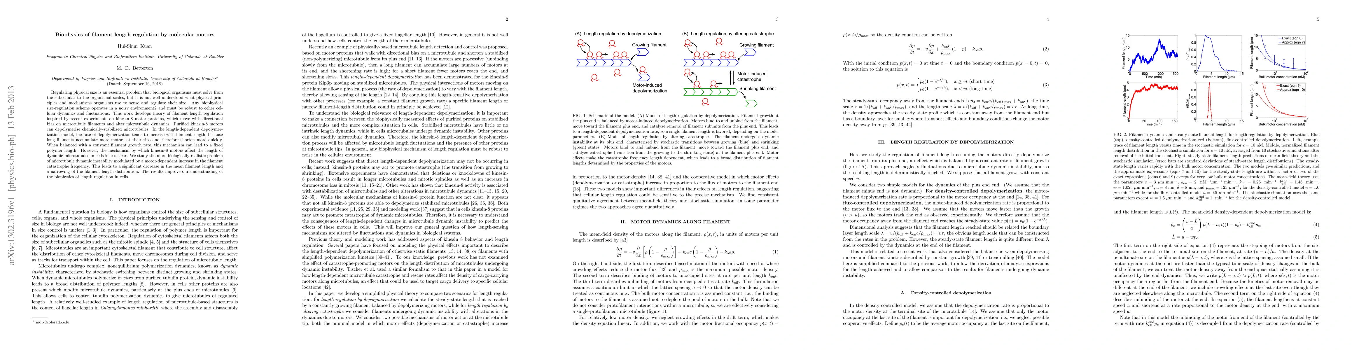 This paper develops a theoretical framework for filament length regulation by kinesin-8 motor proteins, showing how these motors can depolymerize microtubules and modulate dynamic instability to control filament length. The model suggests that increased motor presence on longer filaments enhances depolymerization, leading to a stable average length.
