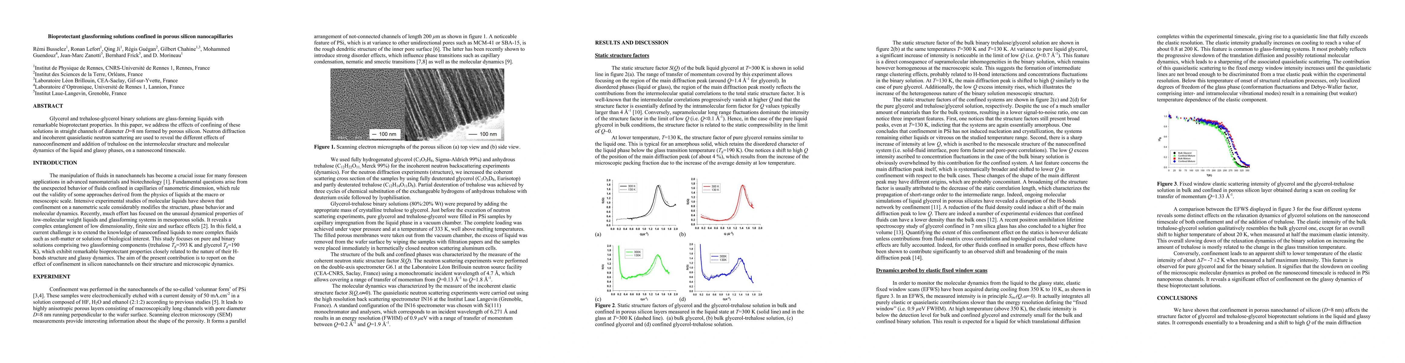 This paper investigates how glycerol and trehalose-glycerol solutions, known for their bioprotective properties, behave when confined in 8 nm diameter porous silicon nanocapillaries. Neutron diffraction and scattering techniques reveal changes in intermolecular structure and dynamics due to nanoconfinement and trehalose addition in both liquid and glassy phases.