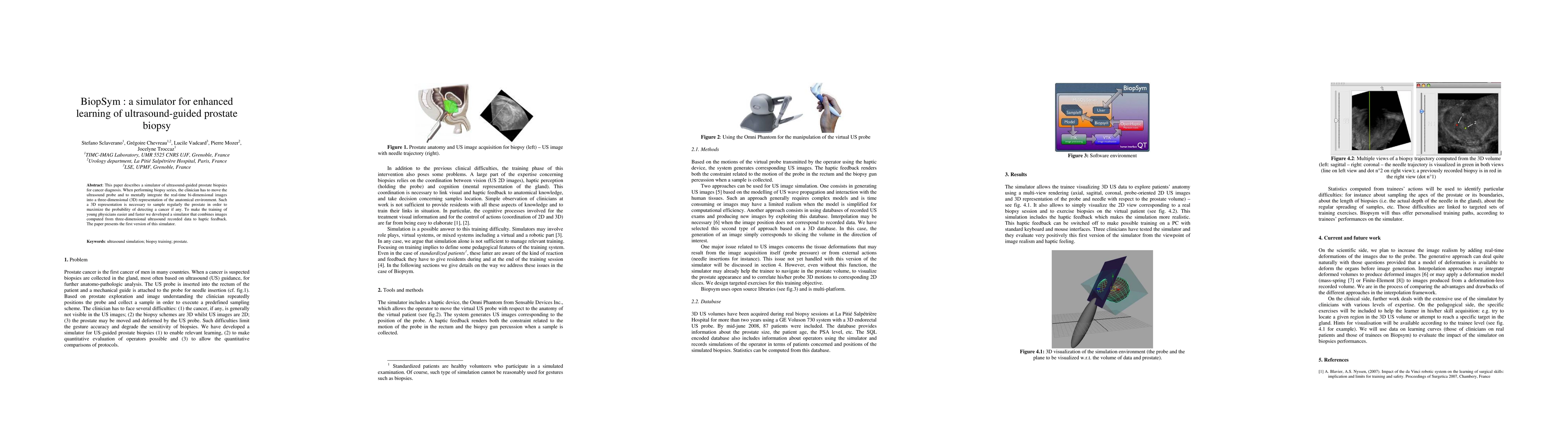 This paper introduces BiopSym, a simulator designed to facilitate the training of young physicians in performing ultrasound-guided prostate biopsies by providing a combination of 3D ultrasound images and haptic feedback. The simulator aims to improve the clinicians' ability to mentally integrate 2D images into a 3D representation, thereby enhancing the detection of prostate cancer.