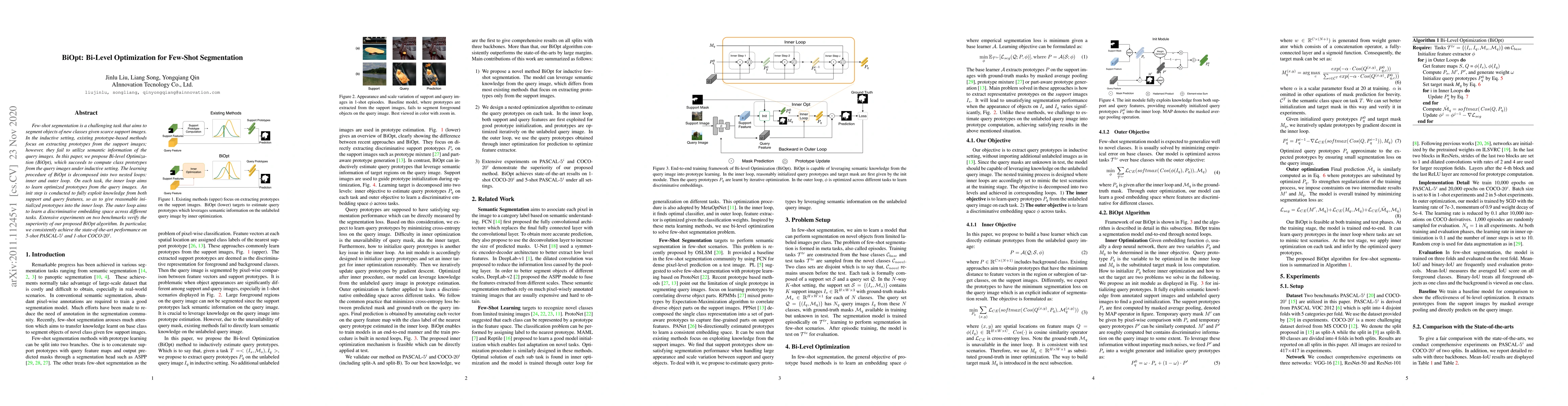 Few-shot segmentation is a challenging task that aims to segment objects of new classes given scarce support images. In the inductive setting, existing prototype-based methods focus on extracting prototypes from the support images; however, they fail to utilize semantic information of the query images. In this paper, we propose Bi-level Optimization (BiOpt), which succeeds to compute class prototypes from the query images under inductive setting. The learning procedure of BiOpt is decomposed into two nested loops: inner and outer loop. On each task, the inner loop aims to learn optimized prototypes from the query images. An init step is conducted to fully exploit knowledge from both support and query features, so as to give reasonable initialized prototypes into the inner loop. The outer loop aims to learn a discriminative embedding space across different tasks. Extensive experiments on two benchmarks verify the superiority of our proposed BiOpt algorithm. In particular, we consistently achieve the state-of-the-art performance on 5-shot PASCAL-$5^i$ and 1-shot COCO-$20^i$.