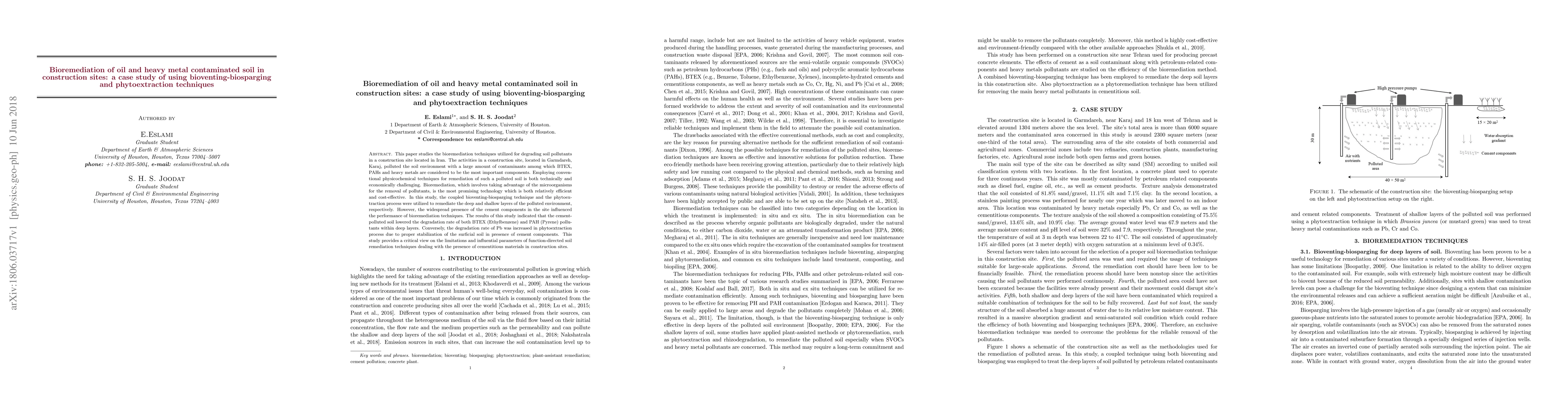 This study investigates the use of bioventing-biosparging and phytoextraction for bioremediation of contaminated soil at a construction site in Iran, finding that cement components negatively impact BTEX and PAH degradation but enhance lead removal via phytoextraction.