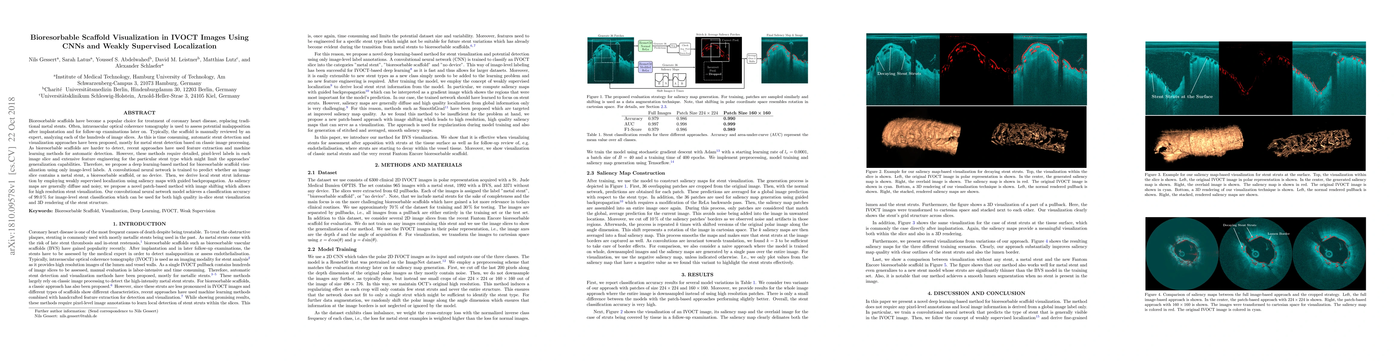 Bioresorbable scaffolds have become a popular choice for treatment of coronary heart disease, replacing traditional metal stents. Often, intravascular optical coherence tomography is used to assess potential malapposition after implantation and for follow-up examinations later on. Typically, the scaffold is manually reviewed by an expert, analyzing each of the hundreds of image slices. As this is time consuming, automatic stent detection and visualization approaches have been proposed, mostly for metal stent detection based on classic image processing. As bioresorbable scaffolds are harder to detect, recent approaches have used feature extraction and machine learning methods for automatic detection. However, these methods require detailed, pixel-level labels in each image slice and extensive feature engineering for the particular stent type which might limit the approaches' generalization capabilities. Therefore, we propose a deep learning-based method for bioresorbable scaffold visualization using only image-level labels. A convolutional neural network is trained to predict whether an image slice contains a metal stent, a bioresorbable scaffold, or no device. Then, we derive local stent strut information by employing weakly supervised localization using saliency maps with guided backpropagation. As saliency maps are generally diffuse and noisy, we propose a novel patch-based method with image shifting which allows for high resolution stent visualization. Our convolutional neural network model achieves a classification accuracy of 99.0 % for image-level stent classification which can be used for both high quality in-slice stent visualization and 3D rendering of the stent structure.