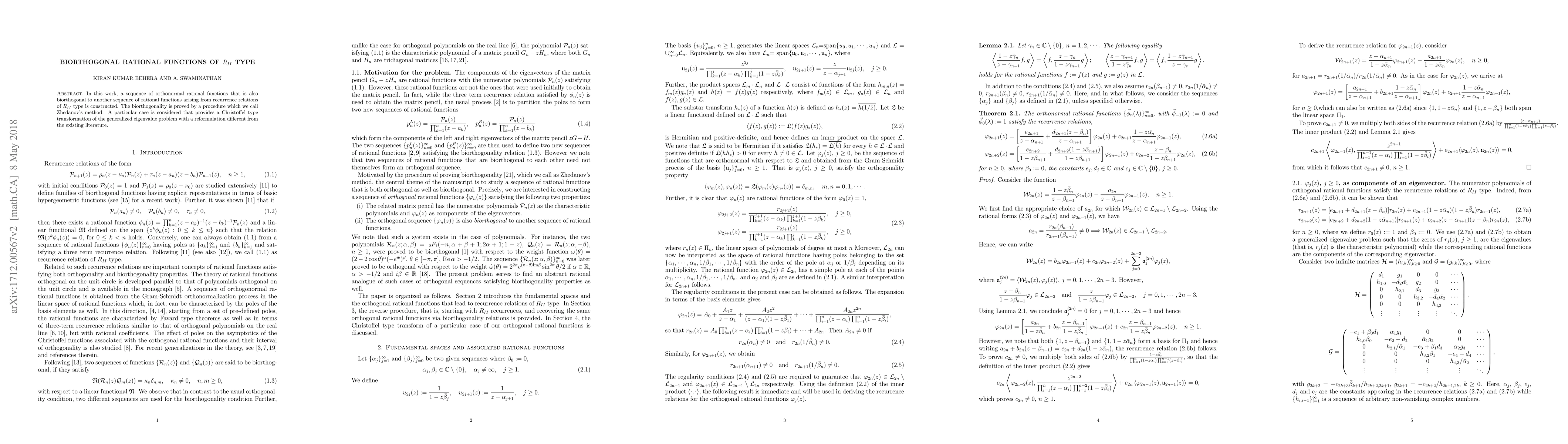 In this work, a sequence of orthonormal rational functions that is also biorthogonal to another sequence of rational functions arising from recurrence relations of $R_{II}$ type is constructed. The biorthogonality is proved by a procedure which we call Zhedanov method. A particular case of a sequence of orthonormal rational functions having denominators of special form is considered to motivate the general case. The particular case provides a Christoffel type transformation of the generalized eigenvalue problem with a reformulation different from the existing literature.