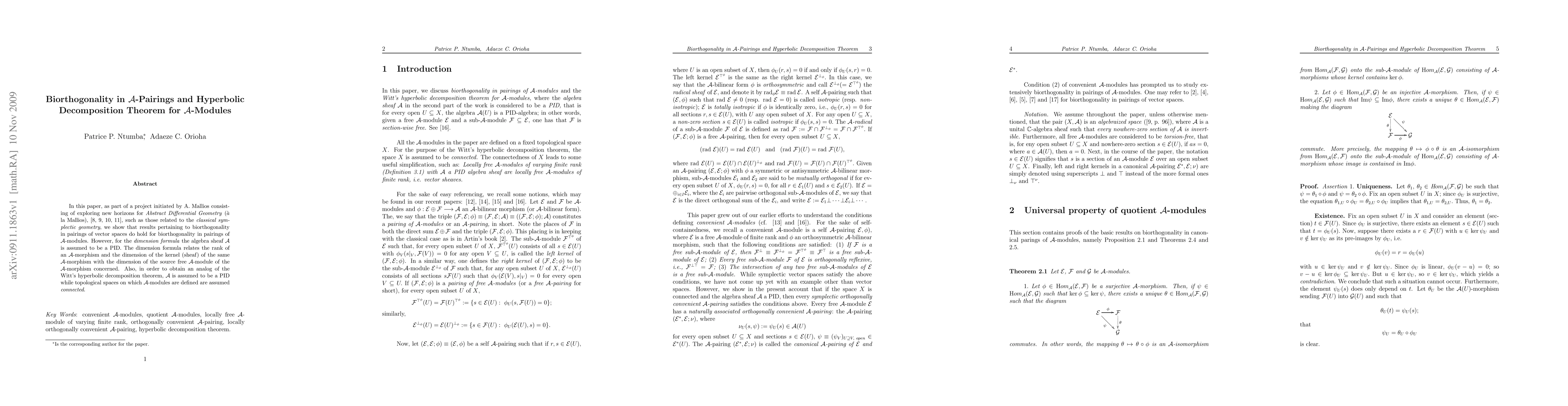 In this paper, as part of a project initiated by A. Mallios consisting of exploring new horizons for \textit{Abstract Differential Geometry} ($\grave{a}$ la Mallios), \cite{mallios1997, mallios, malliosvolume2, modern}, such as those related to the \textit{classical symplectic geometry}, we show that results pertaining to biorthogonality in pairings of vector spaces do hold for biorthogonality in pairings of $\mathcal A$-modules. However, for the \textit{dimension formula} the algebra sheaf $\mathcal A$ is assumed to be a PID. The dimension formula relates the rank of an $\mathcal A$-morphism and the dimension of the kernel (sheaf) of the same $\mathcal A$-morphism with the dimension of the source free $\mathcal A$-module of the $\mathcal A$-morphism concerned. Also, in order to obtain an analog of the Witt's hyperbolic decomposition theorem, $\mathcal A$ is assumed to be a PID while topological spaces on which $\mathcal A$-modules are defined are assumed \textit{connected}.