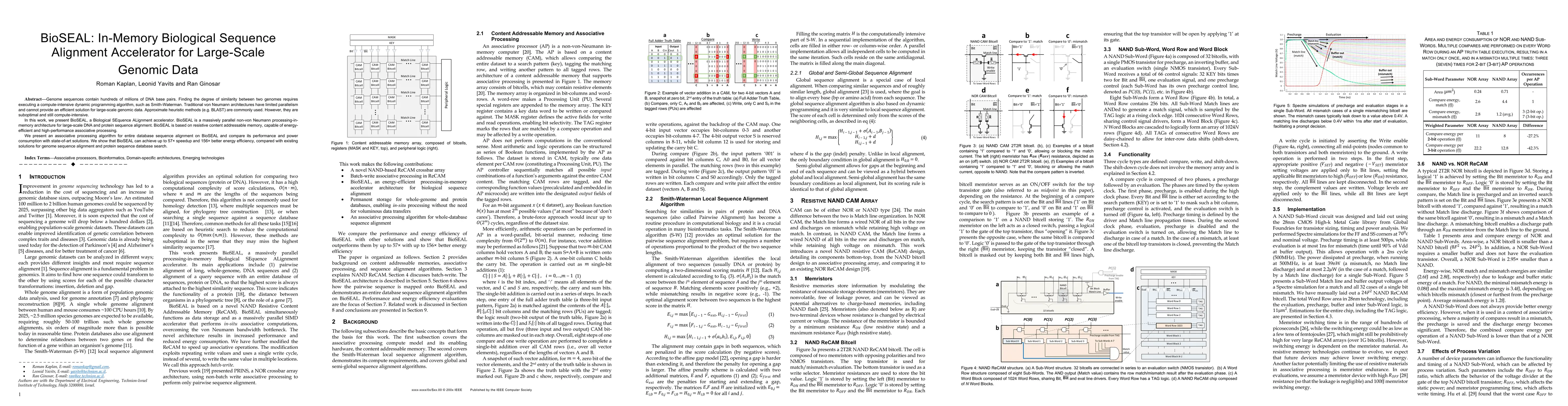 BioSEAL is a novel in-memory accelerator for large-scale genomic data alignment, utilizing a massively parallel non-von Neumann architecture based on resistive content addressable memory. It offers significant speedups and energy efficiency compared to traditional methods, achieving up to 57x speedup and 156x better energy efficiency.