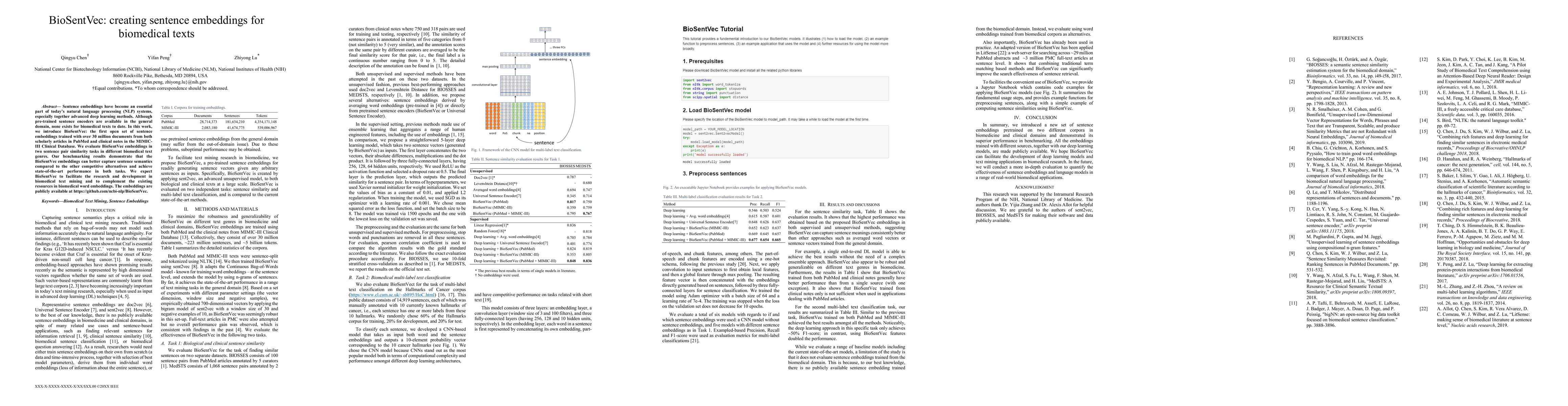BioSentVec introduces the first sentence embeddings for biomedical texts, trained on over 30 million documents from PubMed and MIMIC-III, achieving state-of-the-art performance in sentence pair similarity tasks compared to general domain alternatives. The resource is expected to enhance biomedical text mining research.