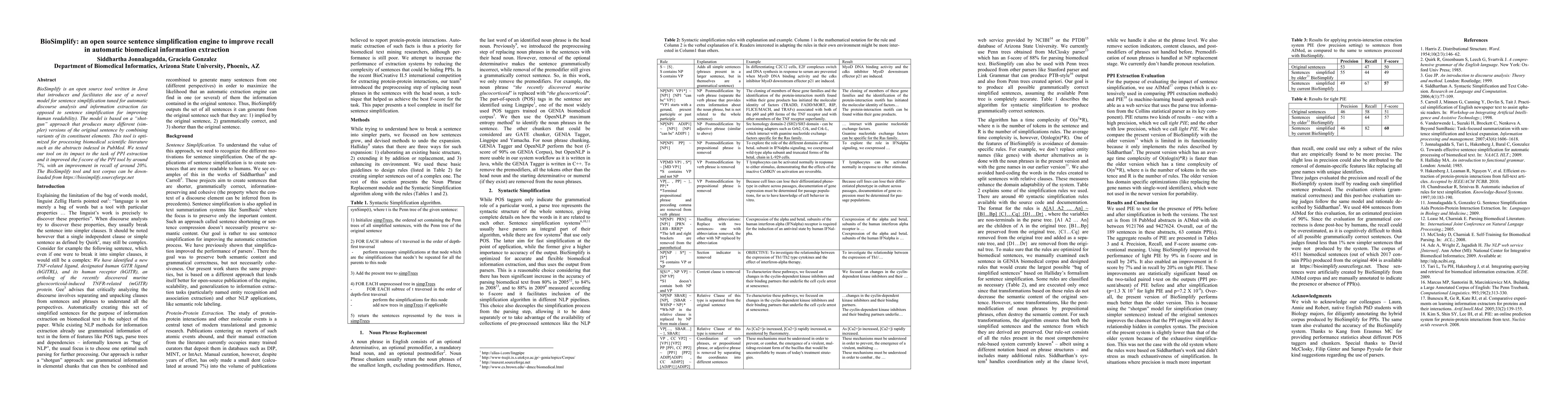 BioSimplify is an open-source Java tool for sentence simplification aimed at enhancing recall in biomedical information extraction. It employs a "shot-gun" method to generate simpler sentence variants, improving the performance of automatic discourse analysis and information extraction tools, notably increasing PPI extraction recall by about 20%.