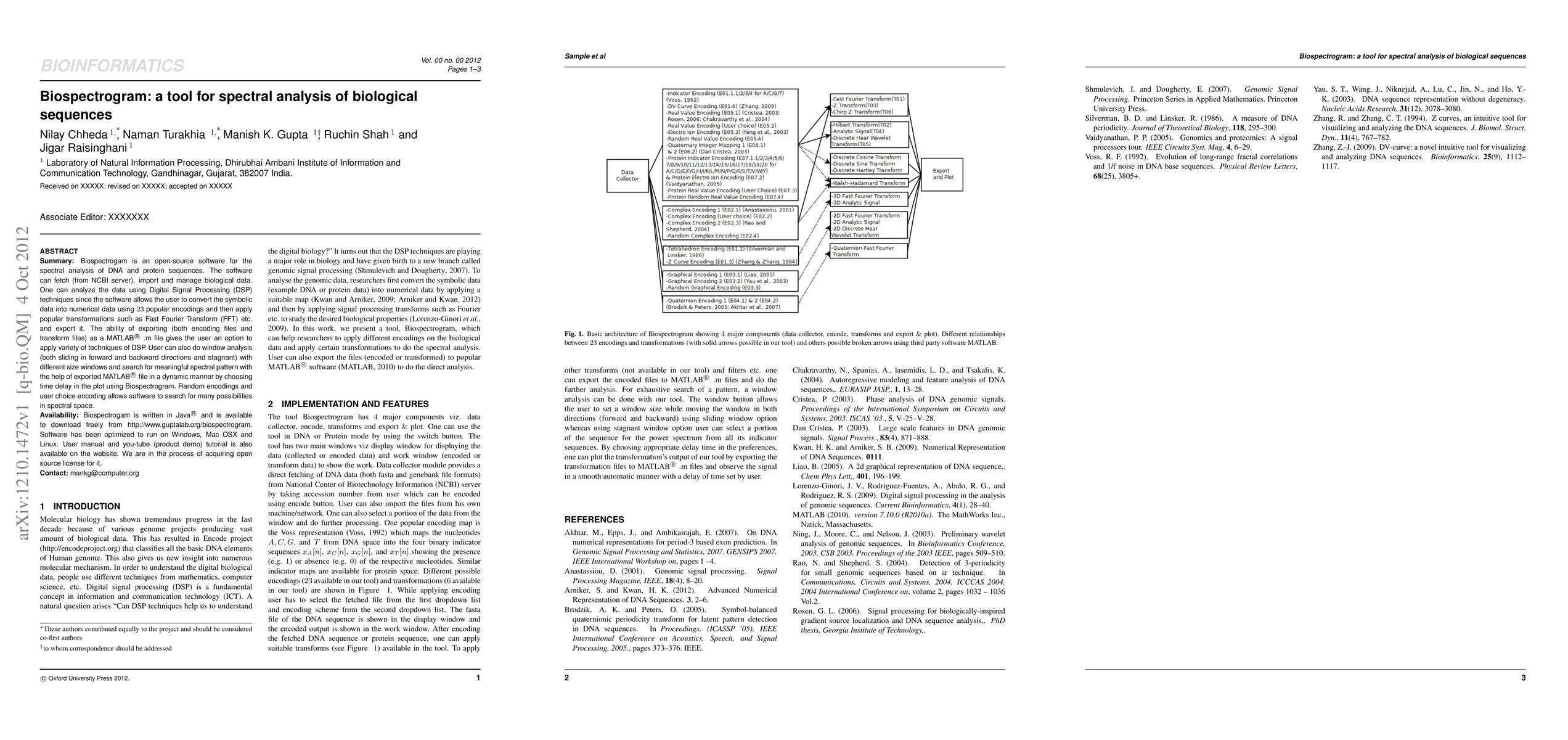 Summary: Biospectrogam is an open-source software for the spectral analysis of DNA and protein sequences. The software can fetch (from NCBI server), import and manage biological data. One can analyze the data using Digital Signal Processing (DSP) techniques since the software allows the user to convert the symbolic data into numerical data using 23 popular encodings and then apply popular transformations such as Fast Fourier Transform (FFT) etc. and export it. The ability of exporting (both encoding files and transform files) as a MATLAB .m file gives the user an option to apply variety of techniques of DSP. User can also do window analysis (both sliding in forward and backward directions and stagnant) with different size windows and search for meaningful spectral pattern with the help of exported MATLAB file in a dynamic manner by choosing time delay in the plot using Biospectrogram. Random encodings and user choice encoding allows software to search for many possibilities in spectral space. Availability: Biospectrogam is written in Java and is available to download freely from http://www.guptalab.org/biospectrogram. Software has been optimized to run on Windows, Mac OSX and Linux. User manual and you-tube (product demo) tutorial is also available on the website. We are in the process of acquiring open source license for it.