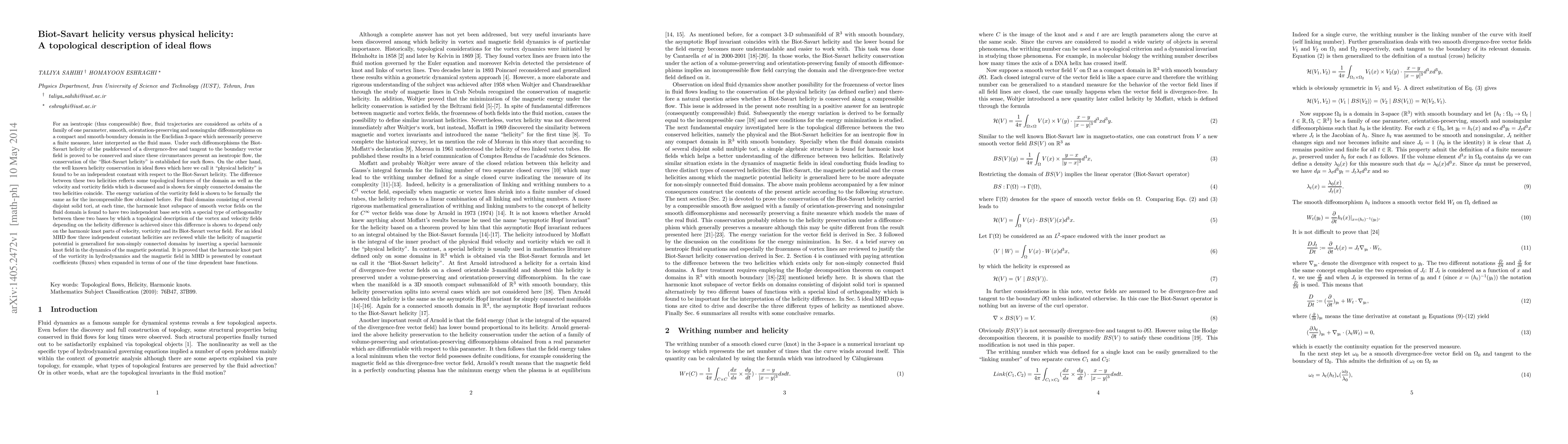For an isentropic (thus compressible) flow, fluid trajectories are considered as orbits of a family of one parameter, smooth, orientation preserving and nonsingular diffeomorphisms on a compact and smooth-boundary domain in the Euclidian 3-space which necessarily preserve a finite measure, later interpreted as the fluid mass. Under such diffeomorphisms the Biot-Savart helicity of the pushforward of a divergence-free and tangent to the boundary vector field is proved to be conserved and since these circumstances present an isentropic flow, the conservation of the "Biot-Savart helicity" is established for such flows. On the other hand, the well known helicity conservation in ideal flows which here we call it "physical helicity" is found to be an independent constant with respect to the Biot-Savart helicity. The difference between these two helicities reflects some topological features of the domain as well as the velocity and vorticity fields which is discussed and is shown for simply connected domains the two helicities coincide. The energy variation of the vorticity field is shown to be formally the same as for the incompressible flow obtained before. For fluid domains consisting of several disjoint solid tori, at each time, the harmonic knot subspace of smooth vector fields on the fluid domain is found to have two independent base sets with a special type of orthogonality between these two bases by which a topological description of the vortex and velocity fields depending on the helicity difference is achieved since this difference is shown to depend only on the harmonic knot parts of velocity, vorticity and its Biot-Savart vector field. For an ideal MHD flow three independent constant helicities are reviewed while the helicity of magnetic potential is generalized for non-simply connected domains by inserting a special harmonic knot field in the dynamics of the magnetic potential.