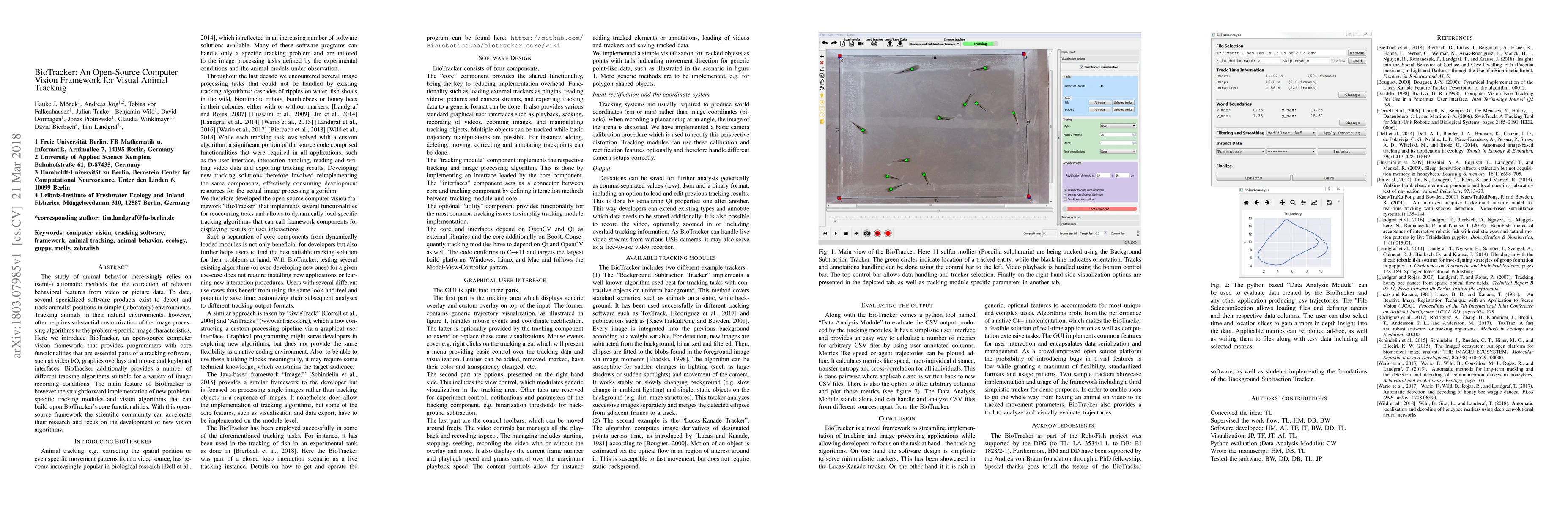 Researchers introduced BioTracker, an open-source computer vision framework that simplifies animal tracking in natural environments by providing customizable algorithms and interfaces.